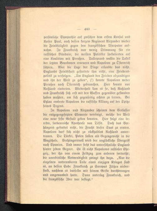 persönliche Sympathie auf zwischen dem ersten Konsul undKaiser Paul, nach dessen kurzem Regiment Alexander wiederdie Feindseligkeit gegen den französischen Usurpator auf-nahm. In Frankreich war wenig Stimmung für einrussisches Bündnis; die meisten Politiker spekulierten aufeine Koalition mit Preußen. Talleyrand wollte die Taktikder letzten Bourbonen erneuern und Napoleon zu Osterreich führen. Aber die Lage der Dinge erlaubte das nicht.Englands Feindschaft gestattete ihm nicht, eine Friedens-politik zu verfolgen. „Um England den Frieden abzunötigenund ihn der Welt zu geben", (!) konnte Napoleon wederPreußen noch Österreich gebrauchen. Hier konnte nurRußland eintreten. Wiederholt kam es so, daß Rußland und Frankreich sich erst mit den Waffen gegenüber gestandenhaben mußten, um sich gegenseitig achten zu lernen. BeiEylau eroberte Napoleon die russische Allianz auf der Spitzeseines Degens.