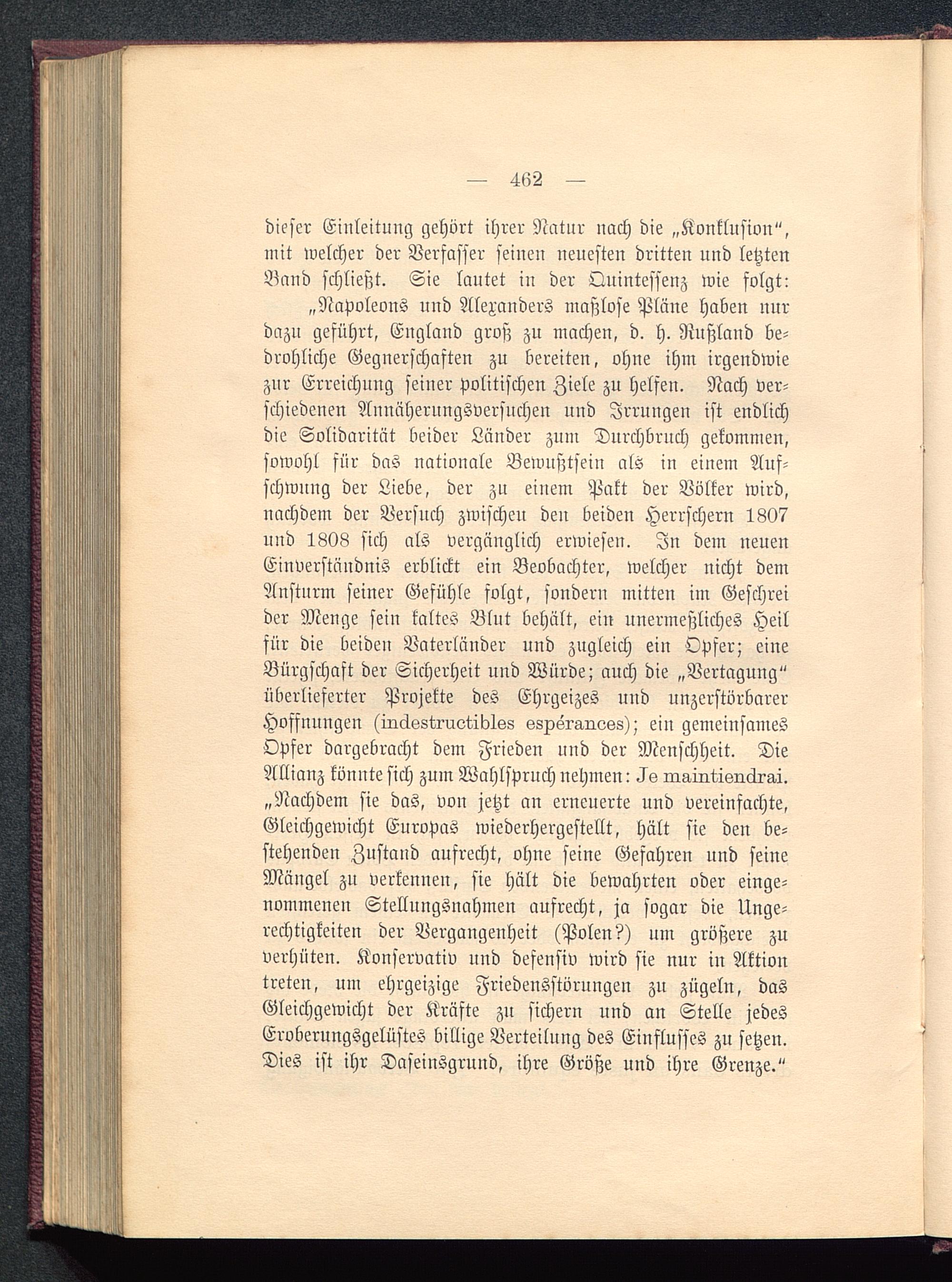 dieser Einleitung gehört ihrer Natur nach die „Konklusion",mit welcher der Verfasser seineu neuesten dritten und letztenBand schließt. Sie lautet iu der Quintessenz wie folgt:„Napoleons und Alexanders maßlose Pläne haben nurdazu geführt, Eugland groß zu machen, d. h. Rußland be-drohliche Gegnerschaften zu bereiten, ohue ihm irgendwiezur Erreichung seiner politischen Ziele zu helfen. Nach ver-schiedenen Annäherungsversuchen und Irrungen ist endlichdie Solidarität beider Länder zum Dnrchbruch gekommen,sowohl fiir das nationale Bewußtsein als in einem Auf-schwung der Liebe, der zn einem Pakt der Völker wird,nachdem der Versuch zwischen deu beiden Herrschern 1807und 1808 sich als vergänglich erwiesen. In dem neuenEinverständnis erblickt ein Beobachter, welcher nicht demAnsturm seiner Gefühle folgt, sondern mitten im Geschreider Menge sein kaltes Blut behält, ein unermeßliches Heilsür die beiden Vaterländer uud zugleich ein Opfer; eineBürgschaft der Sicherheit und Würde; auch die „Vertagung"überlieferter Projekte des Ehrgeizes uud unzerstörbarerHoffnungen (iriclöstrrivtiklss ssxsraruzss); ein gemeinsamesOpfer dargebracht dem Frieden nnd der Menschheit. DieAllianz könnte sich zum Wahlspruch nehmen: iriaintisrulr^i.„Nachdem sie das, von jetzt an erneuerte und vereinfachte,Gleichgewicht Europas wiederhergestellt, hält sie den be-stehenden Zustand aufrecht, ohne seine Gefahren und seineMängel zn verkennen, sie hält die bewahrten oder einge-nommenen Stellungsnahmen aufrecht, ja sogar die Unge-rechtigkeiten der Vergangenheit (Polen ?) um größere zuverhüten. Konservativ und defensiv wird sie nur in Aktiontreten, um ehrgeizige Friedensstörungen zu zügeln, dasGleichgewicht der Kräfte zu sichern und an Stelle jedesEroberungsgelüstes billige Verteilung des Einflusses zu setzen.Dies ist ihr Daseinsgrund, ihre Größe und ihre Grenze."