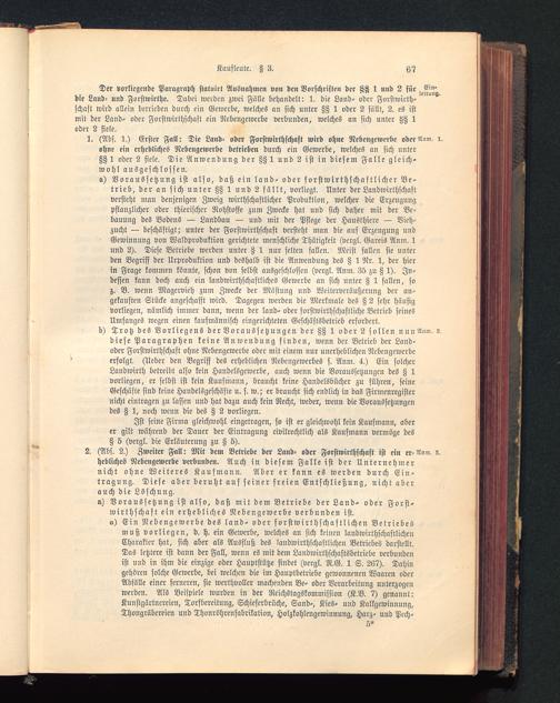 s) Voraussetzung ist also, daß ein land- oder forstwirthschaftlicher Be-trieb, der an sich unter ZS 1 und 2 sällt, vorliegt. Unter der Laudwirthschaftversteht man denjenigen Zweig wirthschaftlicher Produktion, welcher die Erzeugungpflanzlicher oder thierischer Rohstoffe zum Zwecke hat und sich daher mit der Be-bauung des Bodens — Landbau — und mit der Pflege der Hausthiere — Vieh-zucht — beschäftigt; unter der Forstwirthschaft versteht man die auf Erzeugung undGewinnung von Waldproduktion gerichtete menschliche Thätigkeit (vcrgl. Gareis Anm. 1und 2). Diese Betriebe werden unter Z 1 nur selten fallen. Meist fallen sie unterden Begriff der Urproduktion und deshalb ist die Anwendung des Z 1 Nr. 1, der hierin Frage kommen könnte, schon von selbst ausgeschlossen (vcrgl. Anm. 35 zu Z 1). In-dessen kann doch auch ein laudwirthschaftlichcs Gewerbe an sich unter H 1 fallen, soz. B. wenn Magervieh zum Zwecke der Mästung und Weiterveräußerung der an-gekauften Stücke angeschafft wird. Dagegen werden die Merkmale des Z 2 sehr häufigvorliegen, nämlich immer dann, wenn der land- oder forstwirthschaftliche Betrieb seinesUmfanges wegen einen kaufmännisch eingerichteten Geschäftsbetrieb erfordert,b) Trotz des Vorliegens der Voraussetzungen der ZS 1 oder 2 sollen nuuAnm. s.diese Paragraphen keine Anwendung finden, wenn der Betrieb der Land-oder Forstwirthschaft ohne Nebengewerbe oder mit einem nur unerheblichen Nebengewerbeerfolgt. (Ueber den Begriff des erheblichen Nebengewerbes s. Anm. 4.) Ein solcherLandwirth betreibt also kein Haudelsgewerbe, auch wenn die Voraussetzungen des Z 1vorliegen, er selbst ist kein Kaufmann, braucht keine Handelsbücher zu führen, seineGeschäfte sind keine Handelsgeschäfte u. s. w.; er braucht sich endlich in das Firmenregisternicht eintragen zu lassen und hat dazu auch kein Recht, weder, wenn die Voraussetzungendes § 1, noch wenn die des § 2 vorliegen.