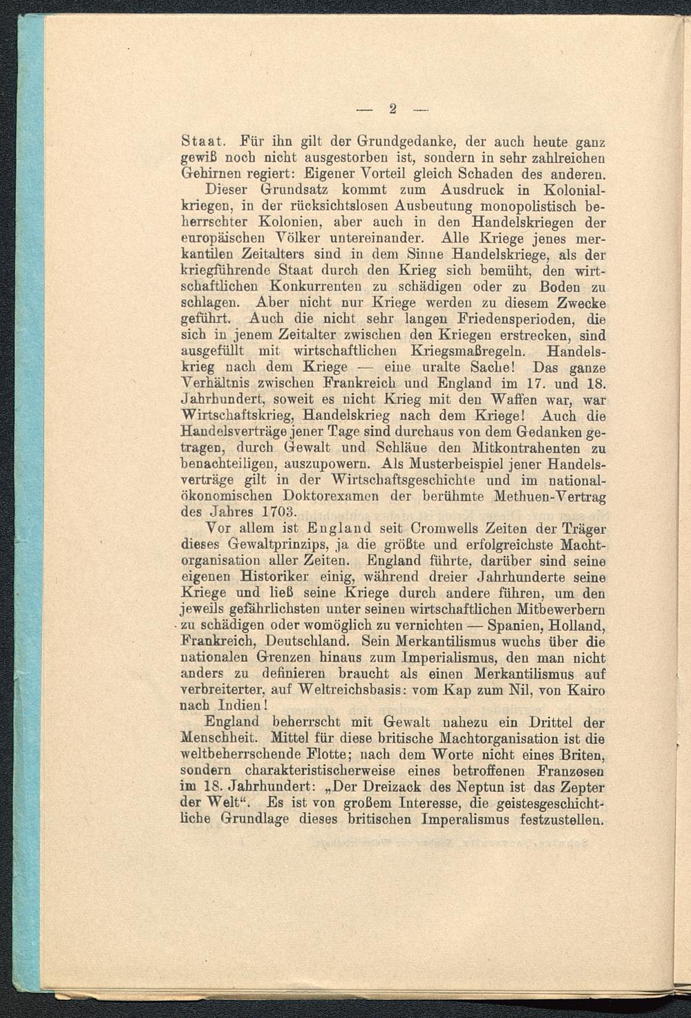 Vor allem ist England seit Cromwells Zeiten der Trägerdieses Gewaltprinzips, ja die größte und erfolgreichste Macht-organisation aller Zeiten. England führte, darüber sind seineeigenen Historiker einig, während dreier Jahrhunderte seineKriege und ließ seine Kriege durch andere führen, um denjeweils gefährlichsten unter seinen wirtschaftlichen Mitbewerbernzu schädigen oder womöglich zu vernichten — Spanien, Holland ,Frankreich, Deutschland . Sein Merkantilismus wuchs über dienationalen Grenzen hinaus zum Imperialismus, den man nichtanders zu definieren braucht als einen Merkantilismus aufverbreiterter, auf Weltreichsbasis: vom Kap zum Nil, von Kairo nach Indien!