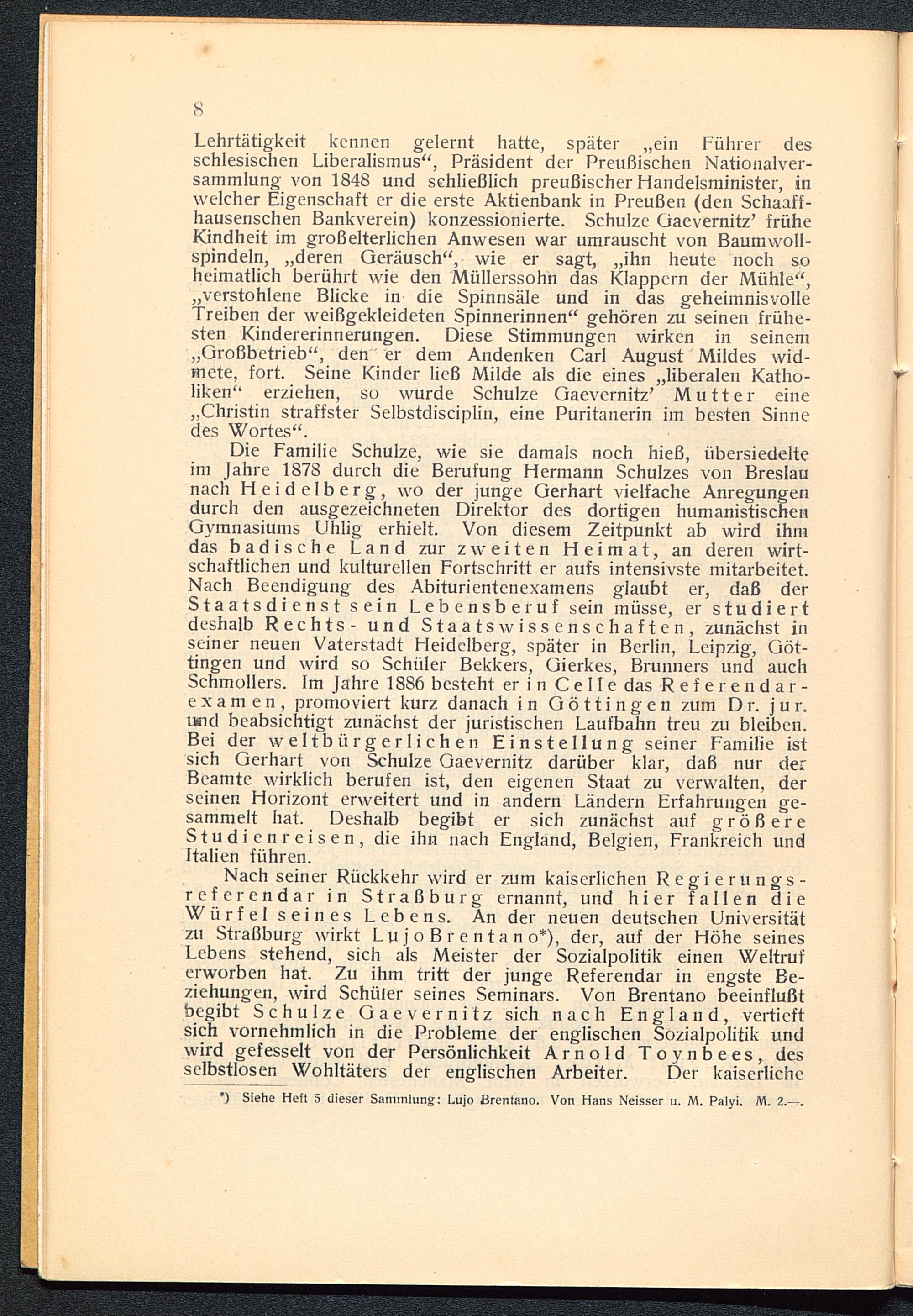 Nach seiner Rückkehr wird er zum kaiserlichen Regierungs-referendar in Straßburg ernannt, und hier fallen dieWürfel seines Lebens. An der neuen deutschen Universitätzu Straßburg wirkt LujoBrentan o*), der, auf der Höhe seinesLebens stehend, sich als Meister der Sozialpolitik einen Weltruferworben hat. Zu ihm tritt der junge Referendar in engste Be-ziehungen, wird Schüler seines Seminars. Von Brentano beeinflußtbegibt Schulze Gaevernitz sich nach England, vertieftsich vornehmlich in die Probleme der englischen Sozialpolitik undwird gefesselt von der Persönlichkeit Arnold Toynbees, desselbstlosen Wohltäters der englischen Arbeiter. Der kaiserliche