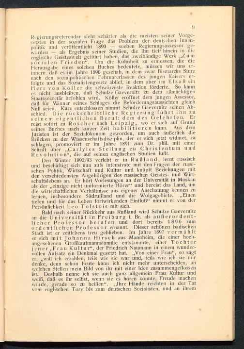 Bald nach seiner Rückkehr aus Rußland wird Schulze Gaevernitzan die Universität in Freiburg i. Br. als außerordent-licher Professor berufen und dort bereits 1 8 96 zumordentlichen Professor ernannt. Dieser schönen badischenStadt ist er zeitlebens treu geblieben. Im Jahre 1897 vermählter sich mit Johanna Hirsch aus Mannheim, die einer hoch-angesehenen Großkaufmannsfamilie entstammte, einer Tochterjener „Frau Kultur", der Friedrich Naumann in einem wunder-vollen Aufsatz ein Denkmal gesetzt hat. „Von einer Frau", so; sagter, „will ich erzählen, teils wie sie war und, teils wie ich sie mirdenke, denn schon heute kann ich nicht mehr unterscheiden, anwelchen Stellen mein Bild von ihr mit einer Idee zusammengeflossenist. Deshalb nenne ich sie auch ganz allgemein Frau Kultur undweiß, daß es ihr selbst, wenn sie es hören könnte, Freude machenwinde, gerade so zu heißen". „Ihre Hände reichten in der Tatvom englischen Tory bis zum deutschen Sozialisten, und an ihrem