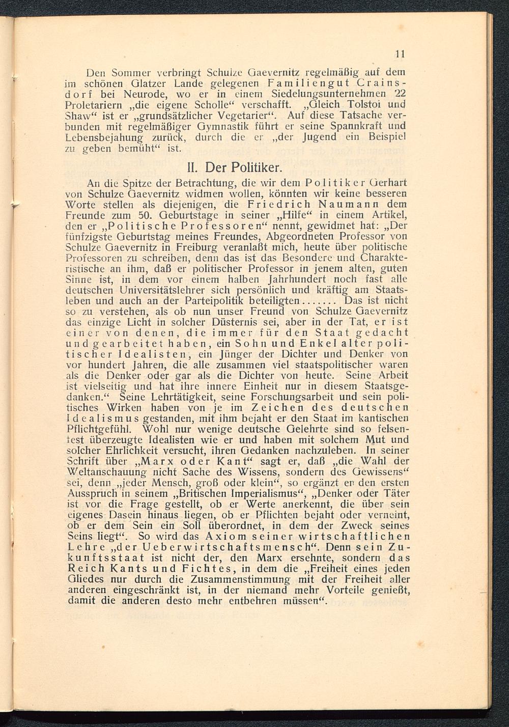 Den Sommer verbringt Schulze Gaevernitz regelmäßig auf demim schönen Glatzer Lande gelegenen Familiengut Crains-dorf bei Neurode, wo er in einem Siedelungsunternehmen '22Proletariern „die eigene Scholle" verschafft. „Gleich Tolstoi undShaw" ist er „grundsätzlicher Vegetarier". Auf diese Tatsache ver-bunden mit regelmäßiger Gymnastik führt er seine Spannkraft undLebensbejahung zurück, durch die er „der Jugend ein Beispielzu geben bemüht" ist.