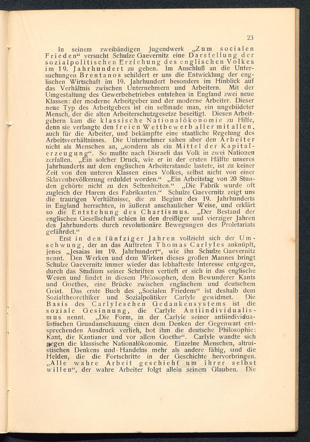 Erst in den fünfziger Jahren vollzieht sich der Um-schwung, der an das Auftreten Thomas Carlyles anknüpft,jenes „Jesaias im 19. Jahrhundert", wie ihn Schulze Gaevernitznennt. Den Werken und dem Wirken dieses großen Mannes bringtSchulze Gaevernitz immer wieder das lebhafteste Interesse entgegen,durch das Studium seiner Schriften vertieft er sich in das englischeWesen und findet in diesem Philosophen, dem Bewunderer Kantsund Goethes, eine Brücke zwischen englischem und deutschemGeist. Das erste Buch des „Socialen Friedens" ist deshalb demSozialtheorethiker und Sozialpolitiker Carlyle gewidmet. DieBasis des Carlyleschen Gedankensystems ist diesoziale Gesinnung, die Carlyle Antiindividualis-mus nennt. „Die Form, in der Carlyle seiner antiindividua-listischen Grundanschauung einen dem Denken der Gegenwart ent-sprechenden Ausdruck verlieh, bot ihm die deutsche Philosophie:Kant, die Kantianer und vor allem Goethe". Carlyle wandte sich^egen die klassische Nationalökonomie. Einzelne Menschen, altrui-stischen Denkens und Handelns mehr als andere fähig, sind dieHelden, die die Fortschritte in der Geschichte hervorbringen.„Alle wahre Arbeit geschieht um ihrer selbstwillen", der wahre Arbeiter folgt allein seinem Glauben. Die