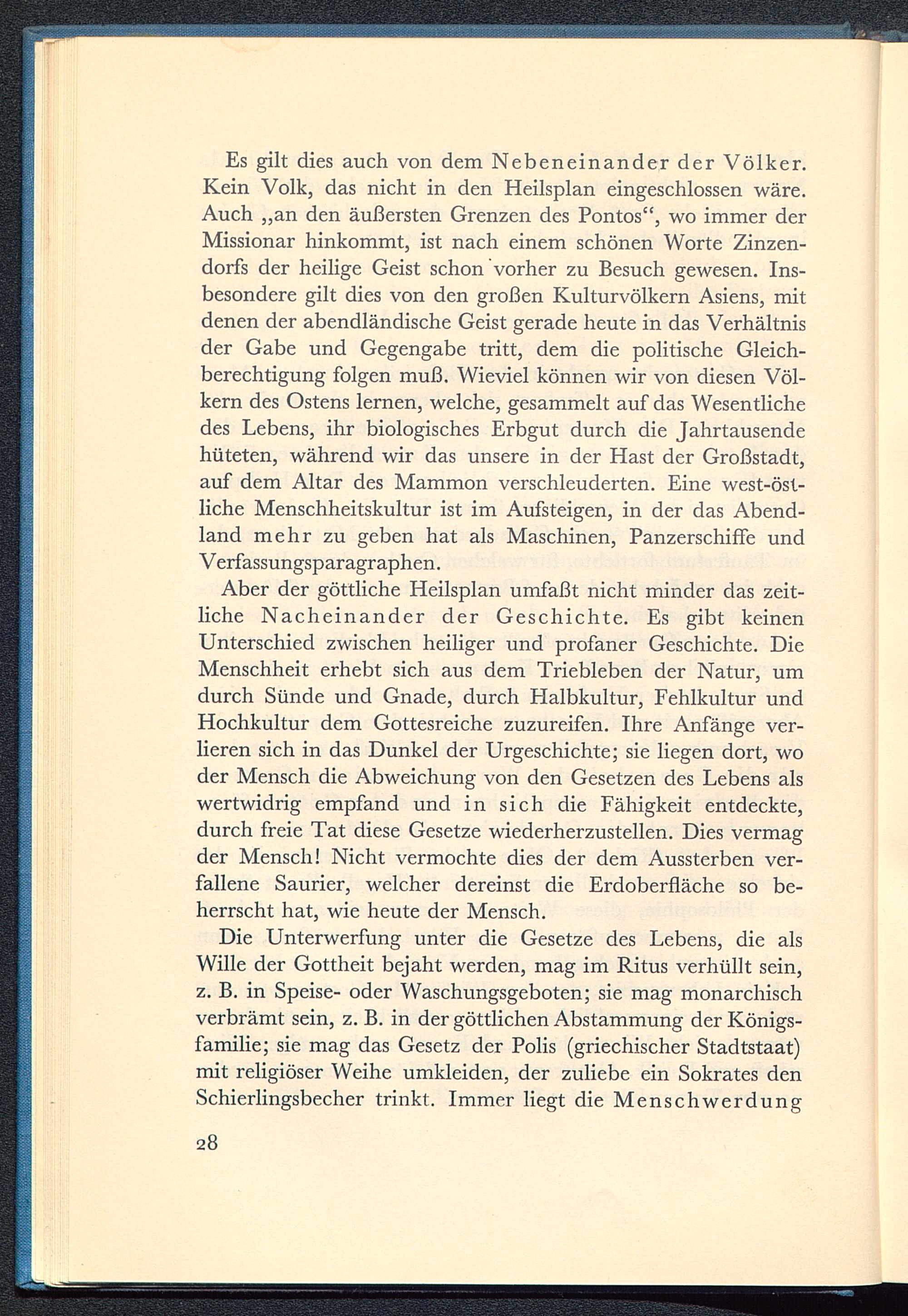 Aber der göttliche Heilsplan umfaßt nicht minder das zeit-liche Nacheinander der Geschichte. Es gibt keinenUnterschied zwischen heiliger und profaner Geschichte. DieMenschheit erhebt sich aus dem Triebleben der Natur, umdurch Sünde und Gnade, durch Halbkultur, Fehlkultur undHochkultur dem Gottesreiche zuzureifen. Ihre Anfänge ver-lieren sich in das Dunkel der Urgeschichte; sie liegen dort, woder Mensch die Abweichung von den Gesetzen des Lebens alswertwidrig empfand und in sich die Fähigkeit entdeckte,durch freie Tat diese Gesetze wiederherzustellen. Dies vermagder Mensch! Nicht vermochte dies der dem Aussterben ver-fallene Saurier, welcher dereinst die Erdoberfläche so be-herrscht hat, wie heute der Mensch.