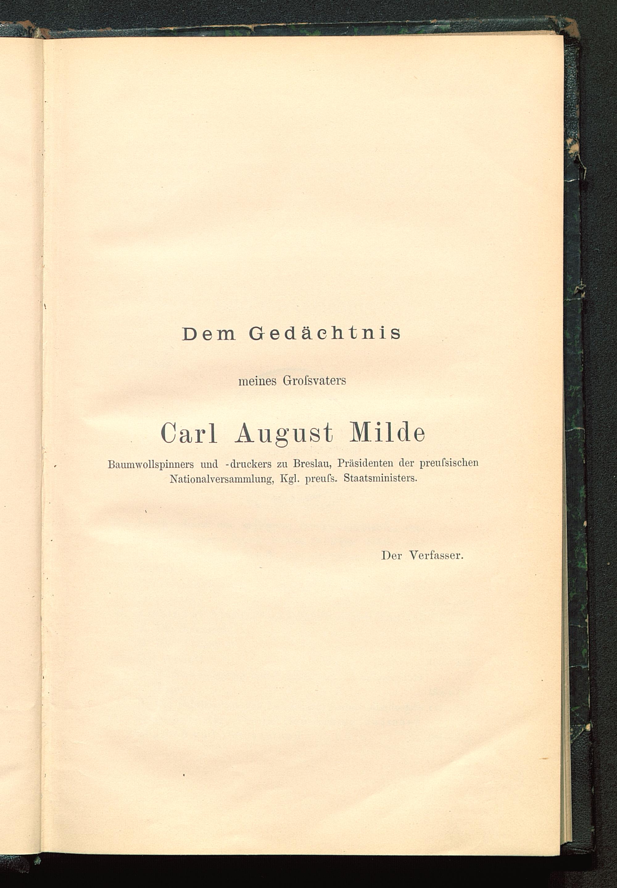Dem Gedächtnismeines GrofsvatersCarl August MildeBaumwollspinners und -druckers zu Breslau , Präsidenten der preufsisckenNationalversammlung, Kgl. preufs. Staatsministers.Der Verfasser.