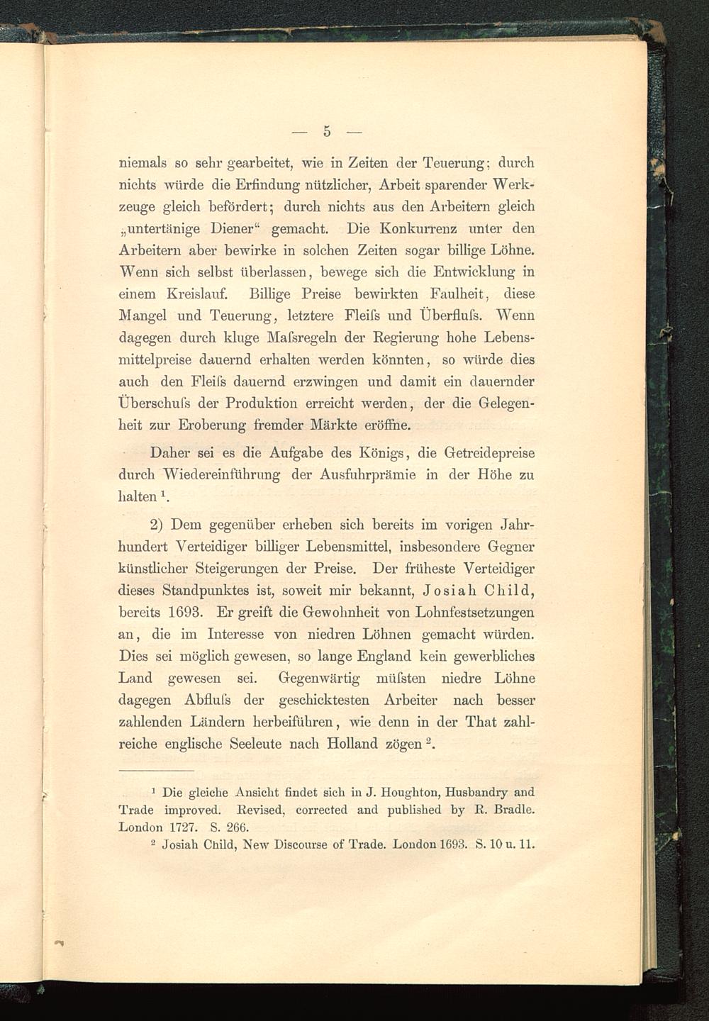 2) Dem gegenüber erheben sich bereits im vorigen Jahr-hundert Verteidiger billiger Lebensmittel, insbesondere Gegnerkünstlicher Steigerungen der Preise. Der früheste Verteidigerdieses Standpunktes ist, soweit mir bekannt, Josiah Child ,bereits 1693. Er greift die Gewohnheit von Lohnfestsetzungenan, die im Interesse von niedren Löhnen gemacht würden.Dies sei möglich gewesen, so lange England kein gewerblichesLand gewesen sei. Gegenwärtig müfsten niedre Löhnedagegen Abflufs der geschicktesten Arbeiter nach besserzahlenden Ländern herbeiführen, wie denn in der That zahl-reiche englische Seeleute nach Holland zögen 2 .