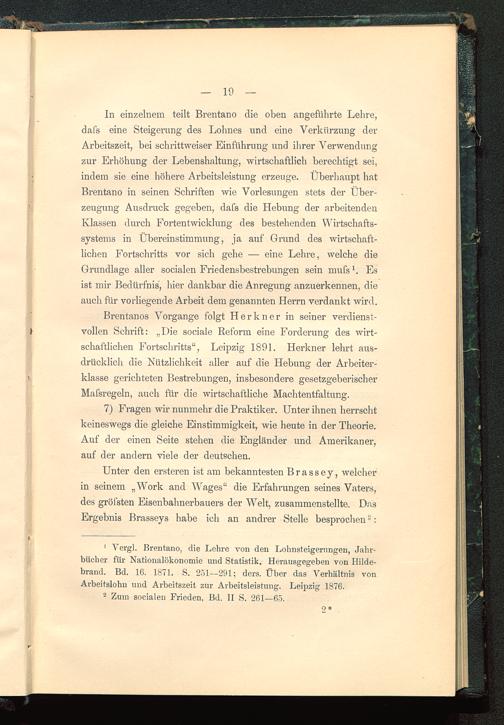 In einzelnem teilt Brentano die oben angeführte Lehre,dafs eine Steigerung des Lohnes und eine Verkürzung derArbeitszeit, bei schrittweiser Einführung und ihrer Verwendungzur Erhöhung der Lebenshaltung, wirtschaftlich berechtigt sei,indem sie eine höhere Arbeitsleistung erzeuge. Überhaupt hatBrentano in seinen Schriften wie Vorlesungen stets der Über-zeugung Ausdruck gegeben, dafs die Hebung der arbeitendenKlassen durch Fortentwicklung des bestehenden Wirtschafts-systems in Übereinstimmung, ja auf Grund des wirtschaft-lichen Fortschritts vor sich gehe — eine Lehre, welche dieGrundlage aller socialen Friedensbestrebungen sein mufs 1 . Esist mir Bedürfnis, hier dankbar die Anregung anzuerkennen, dieauch für vorliegende Arbeit dem genannten Herrn verdankt wird.
