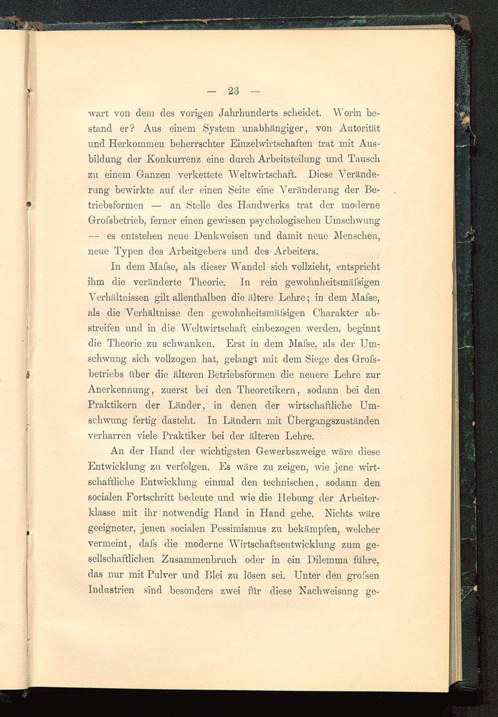 An der Hand der wichtigsten Gewerbszweige wäre dieseEntwicklung zu verfolgen. Es wäre zu zeigen, wie jene wirt-schaftliche Entwicklung einmal den technischen, sodann densocialen Fortschritt bedeute und wie die Hebung der Arbeiter-klasse mit ihr notwendig Hand in Hand gehe. Nichts wäregeeigneter, jenen socialen Pessimismus zu bekämpfen, welchervermeint, dafs die moderne Wirtschaftsentwicklung zum ge-sellschaftlichen Zusammenbruch oder in ein Dilemma führe,das nur mit Pulver und Blei zu lösen sei. Unter den grofsenIndustrien sind besonders zwei für diese Nachweisung ge-