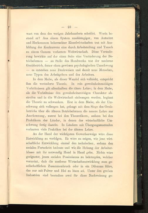 wart von dem des vorigen Jahrhunderts scheidet. Worin be-stand er? Aus einem System unabhängiger, von Autoritätund Herkommen beherrschter Einzelwirtschaften trat mit Aus-bildung der Konkurrenz eine durch Arbeitsteilung und Tauschzu einem Ganzen verkettete Weltwirtschaft. Diese Verände-rung bewirkte auf der einen Seite eine Veränderung der Be-triebsformen — an Stelle des Handwerks trat der moderneGrofsbetrieb, ferner einen gewissen psychologischen Umschwung— es entstehen neue Denkweisen und damit neue Menschen,neue Typen des Arbeitgebers und des Arbeiters.