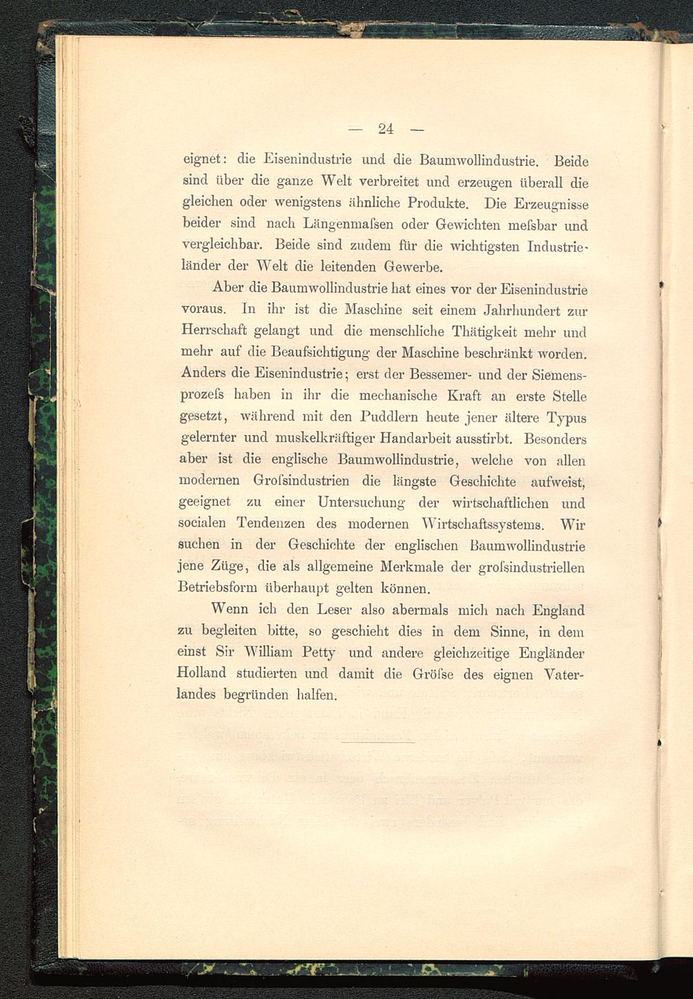 Aber die Baumwollindustrie hat eines vor der Eisenindustrievoraus. In ihr ist die Maschine seit einem Jahrhundert zurHerrschaft gelangt und die menschliche Thätigkeit mehr undmehr auf die Beaufsichtigung der Maschine beschränkt worden.Anders die Eisenindustrie: erst der Bessemer- und der Siemens-prozefs haben in ihr die mechanische Kraft an erste Stellegesetzt, während mit den Puddlern heute jener ältere Typusgelernter und muskelkräftiger Handarbeit ausstirbt. Besondersaber ist die englische Baumwollindustrie, welche von allenmodernen Grofsindustrien die längste Geschichte aufweist,geeignet zu einer Untersuchung der wirtschaftlichen undsocialen Tendenzen des modernen Wirtschaftssystems. Wirsuchen in der Geschichte der englischen Baumwollindustriejene Züge, die als allgemeine Merkmale der grofsindustriellenBetriebsform überhaupt gelten können.