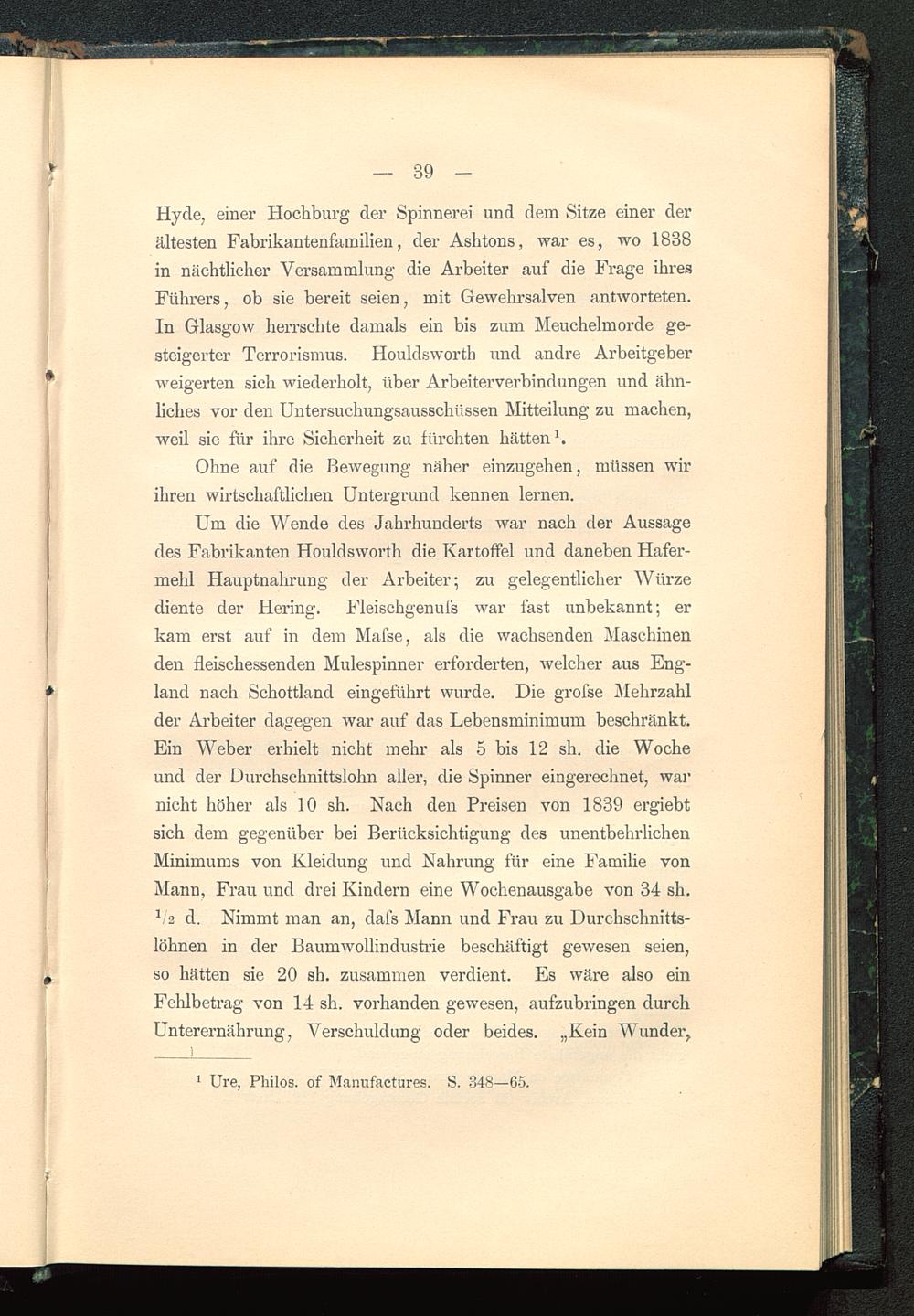 Um die Wende des Jahrhunderts war nach der Aussagedes Fabrikanten Houldsworth die Kartoffel und daneben Hafer-mehl Hauptnahrung der Arbeiter; zu gelegentlicher Würzediente der Hering. Fleischgenufs war fast unbekannt; erkam erst auf in dem Mafse, als die wachsenden Maschinenden fleischessenden Mulespinner erforderten, welcher aus Eng-land nach Schottland eingeführt wurde. Die grofse Mehrzahlder Arbeiter dagegen war auf das Lebensminimum beschränkt.Ein Weber erhielt nicht mehr als 5 bis 12 sh. die Wocheund der Durchschnittslohn aller, die Spinner eingerechnet, warnicht höher als 10 sh. Nach den Preisen von 1839 ergiebtsich dem gegenüber bei Berücksichtigung des unentbehrlichenMinimums von Kleidung und Nahrung für eine Familie vonMann, Frau und drei Kindern eine Wochenausgabe von 34 sh.1 /2 d. Nimmt man an, dafs Mann und Frau zu Durchschnitts-löhnen in der Baumwollindustrie beschäftigt gewesen seien,so hätten sie 20 sh. zusammen verdient. Es wäre also einFehlbetrag von 14 sh. vorhanden gewesen, aufzubringen durchUnterernährung, Verschuldung oder beides. „Kein Wunder,