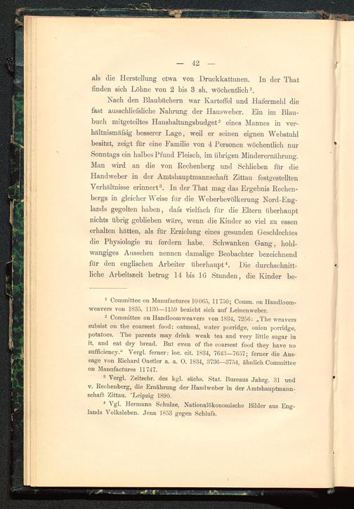 Nach den Blaubüchern war Kartoffel und Hafermehl diefast ausschliefsliche Nahrung der Hausweber. Ein im Blau-buch mitgeteiltes Haushaltungsbudget 2 eines Mannes in ver-hältnismäfsig besserer Lage, weil er seinen eignen Webstuhlbesitzt, zeigt für eine Familie von 4 Personen wöchentlich nurSonntags ein halbes Pfund Fleisch, im übrigen Minderernährung.Man wird an die von Rechenberg und Schlieben für dieHandweber in der Amtshauptmannschaft Zittau festgestelltenVerhältnisse erinnert 3 . In der That mag das Ergebnis Rechen-bergs in gleicher Weise für die Weberbevölkerung Nord-Eng-lands gegolten haben, dafs vielfach für die Eltern überhauptnichts übrig geblieben wäre, wenn die Kinder so viel zu essenerhalten hätten, als für Erzielung eines gesunden Geschlechtesdie Physiologie zu fordern habe. Schwanken Gang, hohl-wangiges Aussehen nennen damalige Beobachter bezeichnendfür den englischen Arbeiter überhaupt 4 . Die durchschnitt-liche Arbeitszeit betrug 14 bis 16 Stunden, die Kinder be-