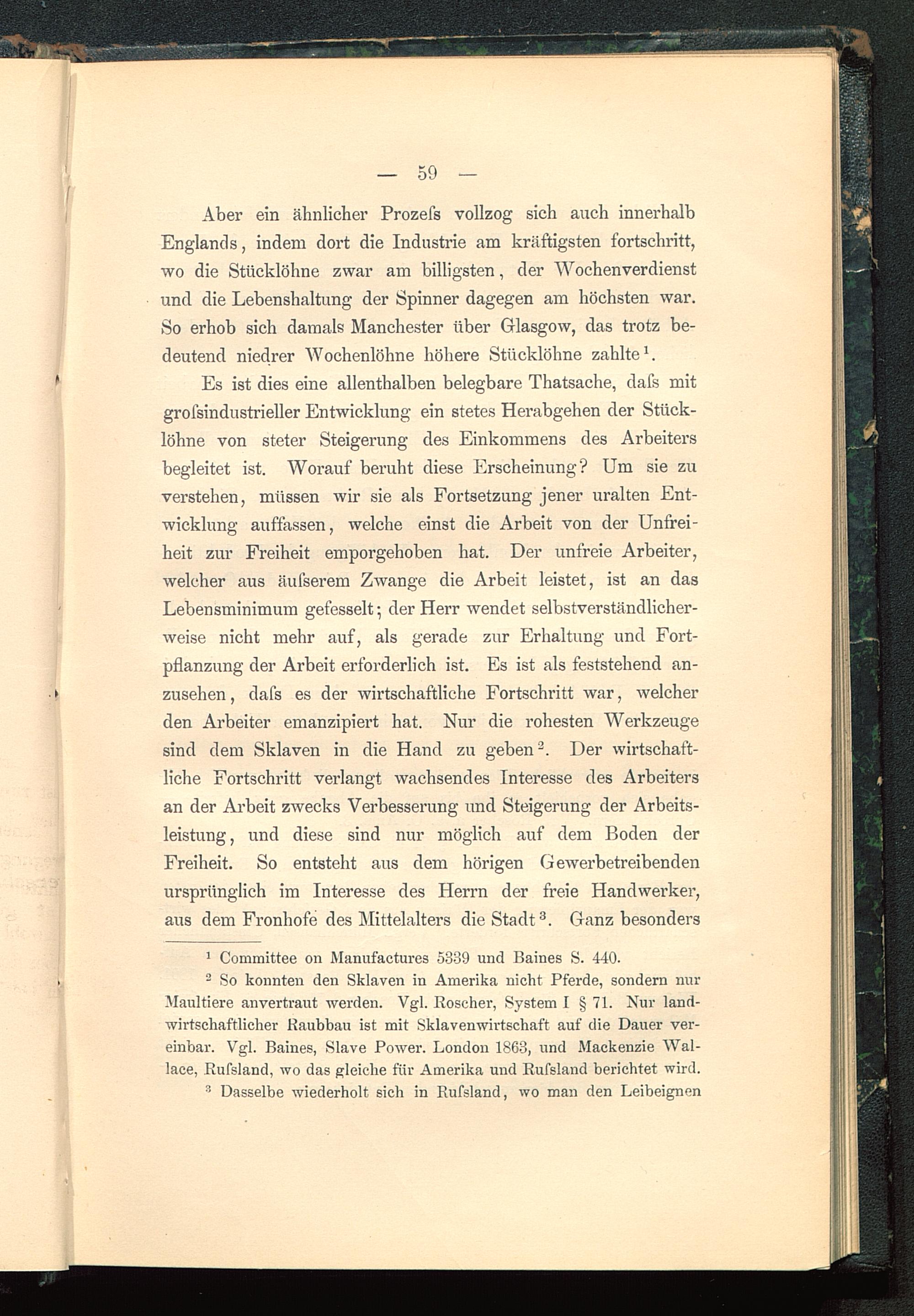 Es ist dies eine allenthalben belegbare Thatsache, dafs mitgrofsindustrieller Entwicklung ein stetes Herabgehen der Stück-löhne von steter Steigerung des Einkommens des Arbeitersbegleitet ist. Worauf beruht diese Erscheinung? Um sie zuverstehen, müssen wir sie als Fortsetzung jener uralten Ent-wicklung auffassen, welche einst die Arbeit von der Unfrei-heit zur Freiheit emporgehoben hat. Der unfreie Arbeiter,welcher aus äufserem Zwange die Arbeit leistet, ist an dasLebensminimum gefesselt; der Herr wendet selbstverständlicher-weise nicht mehr auf, als gerade zur Erhaltung und Fort-pflanzung der Arbeit erforderlich ist. Es ist als feststehend an-zusehen, dafs es der wirtschaftliche Fortschritt war, welcherden Arbeiter emanzipiert hat. Nur die rohesten Werkzeugesind dem Sklaven in die Hand zu geben 2 . Der wirtschaft-liche Fortschritt verlangt wachsendes Interesse des Arbeitersan der Arbeit zwecks Verbesserung und Steigerung der Arbeits-leistung, und diese sind nur möglich auf dem Boden derFreiheit. So entsteht aus dem hörigen G ewerbetreibendenursprünglich im Interesse des Herrn der freie Handwerker,aus dem Fronhofe des Mittelalters die Stadt 3 . Ganz besonders
