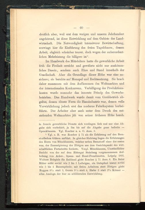 deutlich aber, weil erst dem vorigen und unserm Jahrhundertangehörend, ist diese Entwicklung auf dem Gebiete der Land-wirtschaft. Die Notwendigkeit intensiverer Bewirtschaftung,erzwingt hier die Einführung des freien Tagelöhners, dessenArbeit, obgleich scheinbar teurer, doch wegen der aufserordent-lichen Mehrleistung die billigere ist 1 .