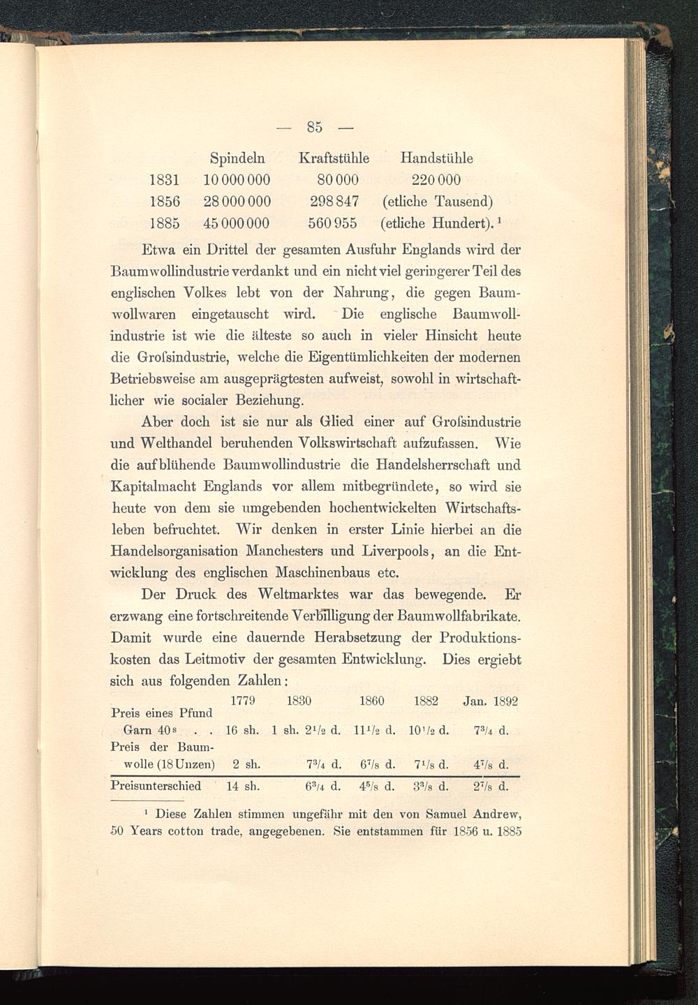 Etwa ein Drittel der gesamten Ausfuhr Englands wird derBaumwollindustrie verdankt und ein nicht viel geringerer Teil desenglischen Volkes lebt von der Nahrung, die gegen Baum-wollwaren eingetauscht wird. Die englische Baumwoll-industrie ist wie die älteste so auch in vieler Hinsicht heutedie Grofsindustrie, welche die Eigentümlichkeiten der modernenBetriebsweise am ausgeprägtesten aufweist, sowohl in wirtschaft-licher wie socialer Beziehung.