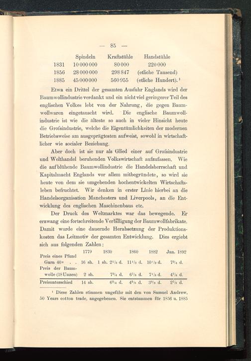 Der Druck des Weltmarktes war das bewegende. Ererzwang eine fortschreitende Verbüligung der Baumwollfabrikate.Damit wurde eine dauernde Herabsetzung der Produktions-kosten das Leitmotiv der gesamten Entwicklung. Dies ergiebtsich aus folgenden Zahlen;