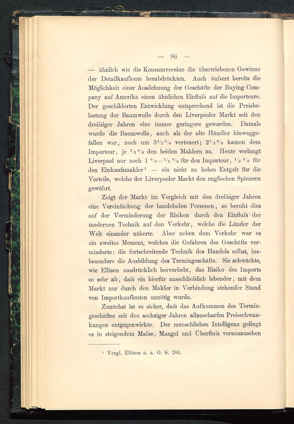 Zeigt der Markt im Vergleich mit den dreifsiger Jahreneine Vereinfachung der handelnden Personen, so beruht diesauf der Verminderung der Risiken durch den Einflufs dermodernen Technik auf den Verkehr, welche die Länder derWelt einander näherte. Aber neben dem Verkehr war esein zweites Moment, welches die Gefahren des Geschäfts ver-minderte: die fortschreitende Technik des Handels selbst, ins-besondere die Ausbildung des Termingeschäfts. Sie schwächte,wie Ellison ausdrücklich hervorhebt, das Risiko des Importsso sehr ab, dafs ein hierfür ausschliesslich lebender, mit demMarkt nur durch den Makler in Verbindung stehender Standvon Importkaufleuten unnötig wurde.