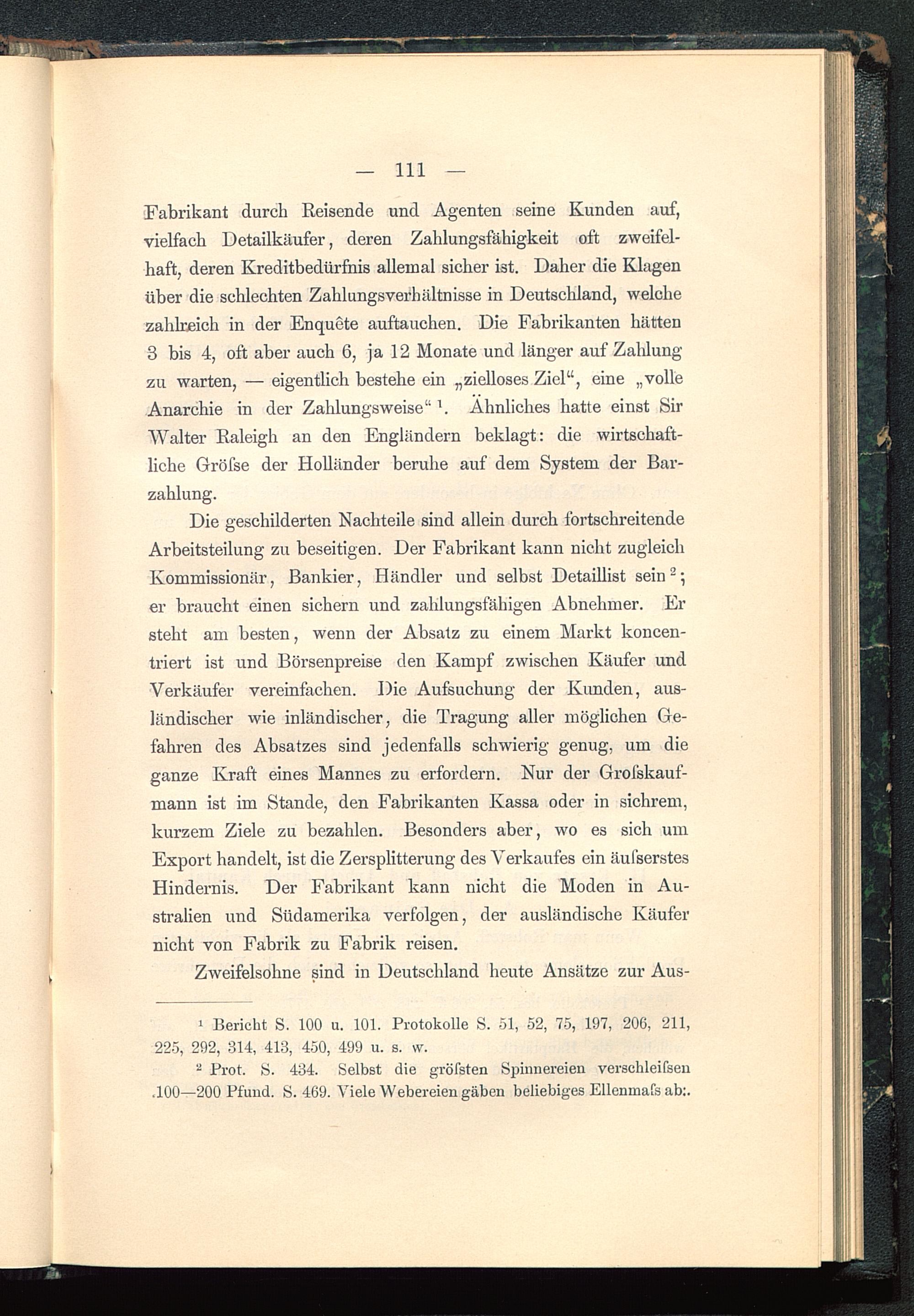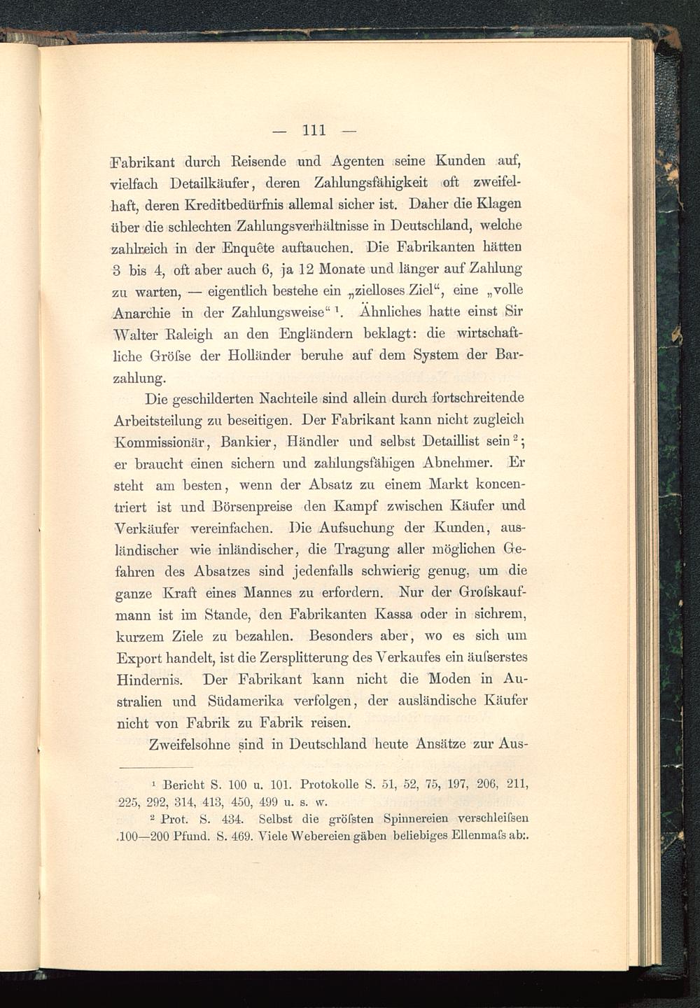 Fabrikant durch Reisende und Agenten seine Kunden auf,vielfach Detailkäufer, deren Zahlungsfähigkeit oft zweifel-haft, deren Kreditbedürfnis allemal sicher ist. Daher die Klagenüber die schlechten Zahlungsverhältnisse in Deutschland , welchezahlreich in der Enquete auftauchen. Die Fabrikanten hätten3 bis 4, oft aber auch 6, ja 12 Monate und länger auf Zahlungzu warten, — eigentlich bestehe ein „zielloses Ziel", eine „volleAnarchie in der Zahlungsweise" 1 . Ahnliches hatte einst SirWalter Raleigh an den Engländern beklagt: die wirtschaft-liche Gröfse der Holländer beruhe auf dem System der Bar-zahlung.