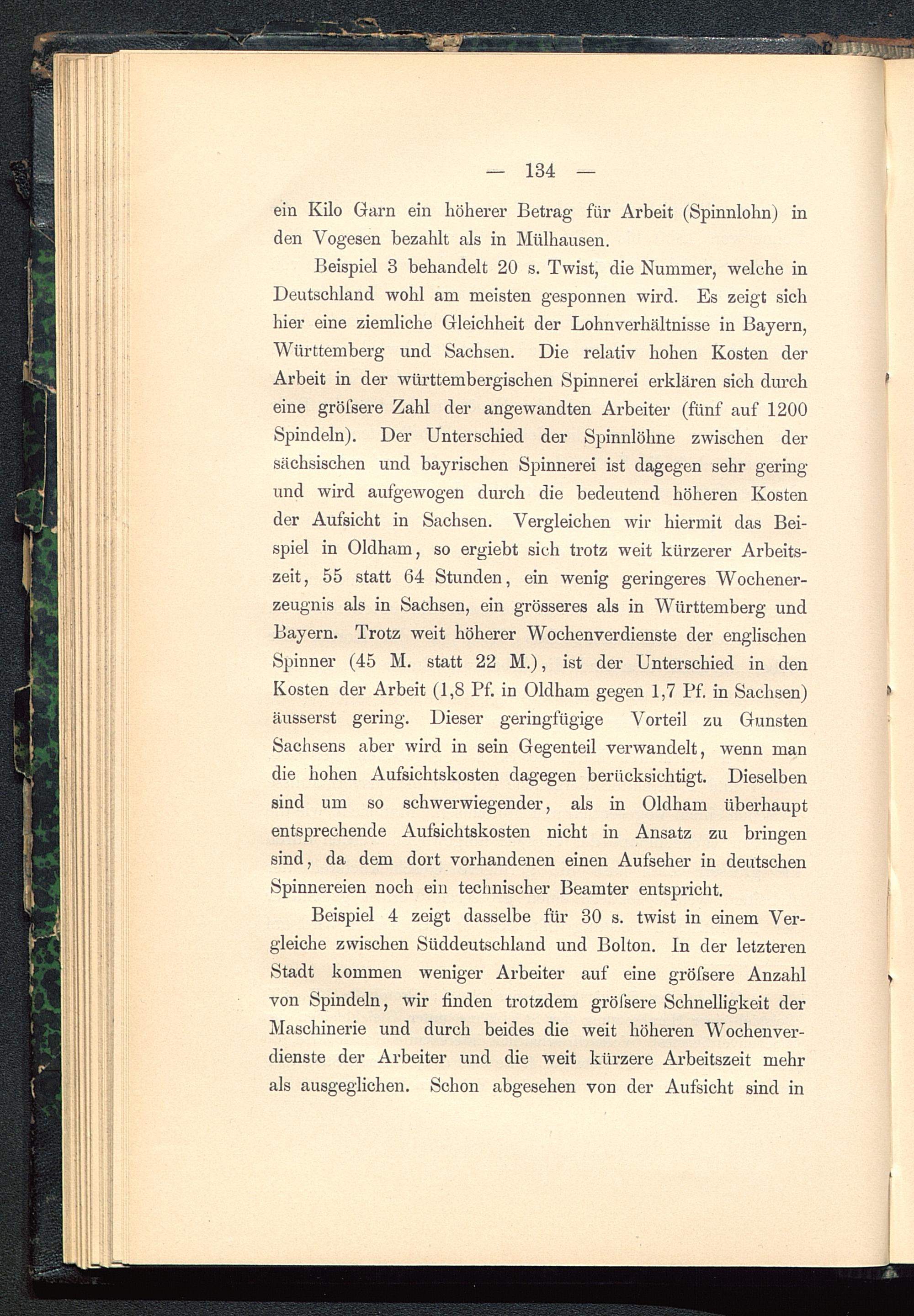 Beispiel 4 zeigt dasselbe für 30 s. twist in einem Ver-gleiche zwischen Süddeutschland und Bolton. In der letzterenStadt kommen weniger Arbeiter auf eine gröfsere Anzahlvon Spindeln, wir finden trotzdem gröfsere Schnelligkeit derMaschinerie und durch beides die weit höheren Wochenver-dienste der Arbeiter und die weit kürzere Arbeitszeit mehrals ausgeglichen. Schon abgesehen von der Aufsicht sind in