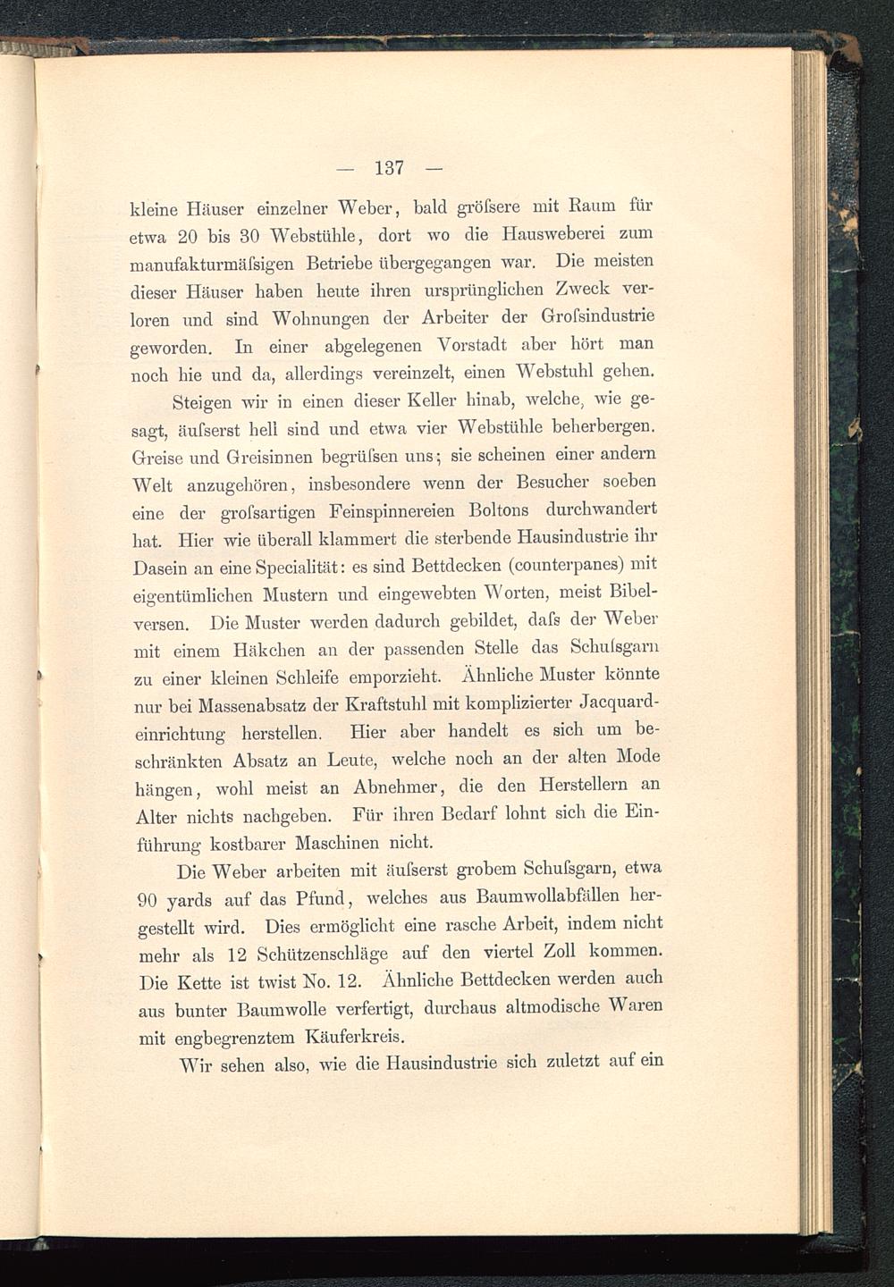 Steigen wir in einen dieser Keller hinab, welche, wie ge-sagt, äufserst hell sind und etwa vier Webstühle beherbergen.Greise und Greisinnen begrüfsen uns; sie scheinen einer andernWelt anzugehören, insbesondere wenn der Besucher soebeneine der grofsartigen Feinspinnereien Boltons durchwanderthat. Hier wie überall klammert die sterbende Hausindustrie ihrDasein an eine Specialität: es sind Bettdecken (counterpanes) miteigentümlichen Mustern und eingewebten Worten, meist Bibel-versen. Die Muster werden dadurch gebildet, dafs der Webermit einem Häkchen an der passenden Stelle das Schulsgarnzu einer kleinen Schleife emporzieht. Ähnliche Muster könntenur bei Massenabsatz der Kraftstuhl mit komplizierter Jacquard-einrichtung herstellen. Hier aber handelt es sich um be-schränkten Absatz an Leute, welche noch an der alten Modehängen, wohl meist an Abnehmer, die den Herstellern anAlter nichts nachgeben. Für ihren Bedarf lohnt sich die Ein-führung kostbarer Maschinen nicht.