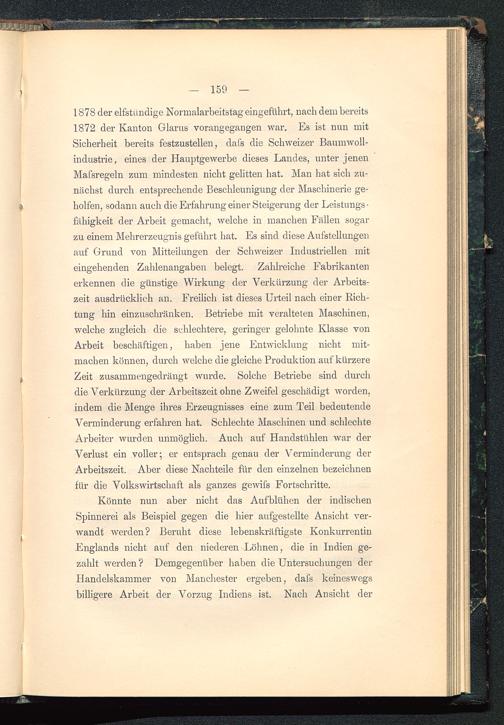 1878 der elfstündige Normalarbeitstag eingeführt, nach dem bereits1872 der Kanton Glarus vorangegangen war. Es ist nun mitSicherheit bereits festzustellen, dafs die Schweizer Baumwoll-industrie, eines der Hauptgewerbe dieses Landes, unter jenenMafsregeln zum mindesten nicht gelitten hat. Man hat sich zu-nächst durch entsprechende Beschleunigung der Maschinerie ge-holfen, sodann auch die Erfahrung einer Steigerung der Leistungs -fahigkeit der Arbeit gemacht, welche in manchen Fällen sogarzu einem Mehrerzeugnis geführt hat. Es sind diese Aufstellungenauf Grund von Mitteilungen der Schweizer Industriellen miteingehenden Zahlenangaben belegt. Zahlreiche Fabrikantenerkennen die günstige Wirkung der Verkürzung der Arbeits-zeit ausdrücklich an. Freilich ist dieses Urteil nach einer Rich-tung hin einzuschränken. Betriebe mit veralteten Maschinen,welche zugleich die schlechtere, geringer gelohnte Klasse vonArbeit beschäftigen, haben jene Entwicklung nicht mit-machen können, durch welche die gleiche Produktion auf kürzereZeit zusammengedrängt wurde. Solche Betriebe sind durchdie Verkürzung der Arbeitszeit ohne Zweifel geschädigt worden,indem die Menge ihres Erzeugnisses eine zum Teil bedeutendeVerminderung erfahren hat. Schlechte Maschinen und schlechteArbeiter wurden unmöglich. Auch auf Handstühlen war derVerlust ein voller; er entsprach genau der Verminderung derArbeitszeit. Aber diese Nachteile für den einzelnen bezeichnenfür die Volkswirtschaft als ganzes gewifs Fortschritte.