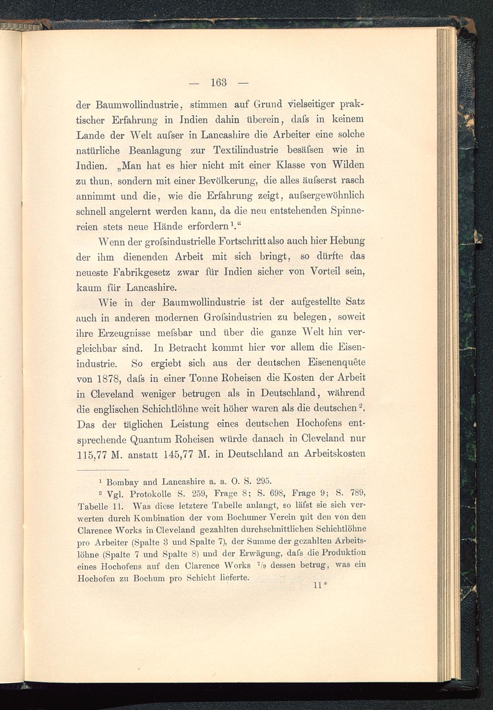 2 Vgl. Protokolle S. 259, Frage 8; S. 698, Frage 9; S. 789,Tabelle 11. Was diese letztere Tabelle anlangt, so läfst sie sieb ver-werten durch Kombination der vom Bochumer Verein Qiit den von denClarence Works in Cleveland gezahlten durchschnittlichen Schichtlöhnepro Arbeiter (Spalte 3 und Spalte 7), der Summe der gezahlten Arbeits-löhne (Spalte 7 und Spalte 8) und der Erwägung, dafs die Produktioneines Hochofens auf den Clarence Works v'o dessen betrug, was einHochofen zu Bochum pro Schicht lieferte.