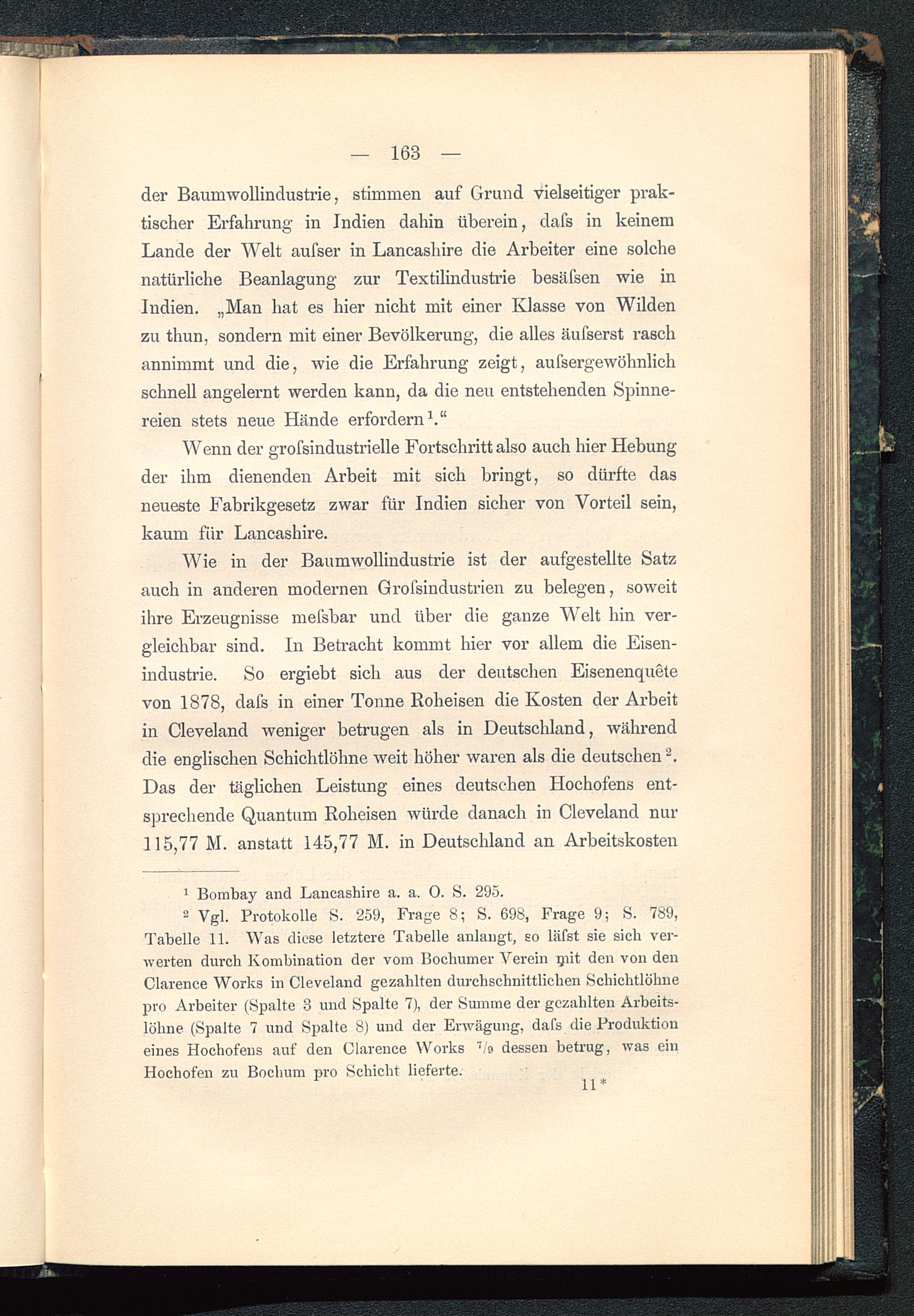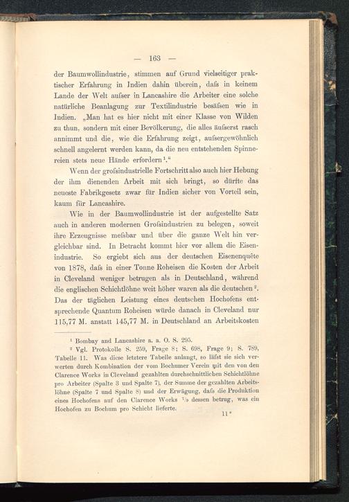 Wie in der Baumwollindustrie ist der aufgestellte Satzauch in anderen modernen Grofsindustrien zu belegen, soweitihre Erzeugnisse mefsbar und über die ganze Welt hin ver-gleichbar sind. In Betracht kommt hier vor allem die Eisen-industrie. So ergiebt sich aus der deutschen Eisenenquetevon 1878, dafs in einer Tonne Roheisen die Kosten der Arbeitin Cleveland weniger betrugen als in Deutschland , währenddie englischen Schichtlöhne weit höher waren als die deutschen 2 .Das der täglichen Leistung eines deutschen Hochofens ent-sprechende Quantum Roheisen würde danach in Cleveland nur115,77 M. anstatt 145,77 M. in Deutschland an Arbeitskosten