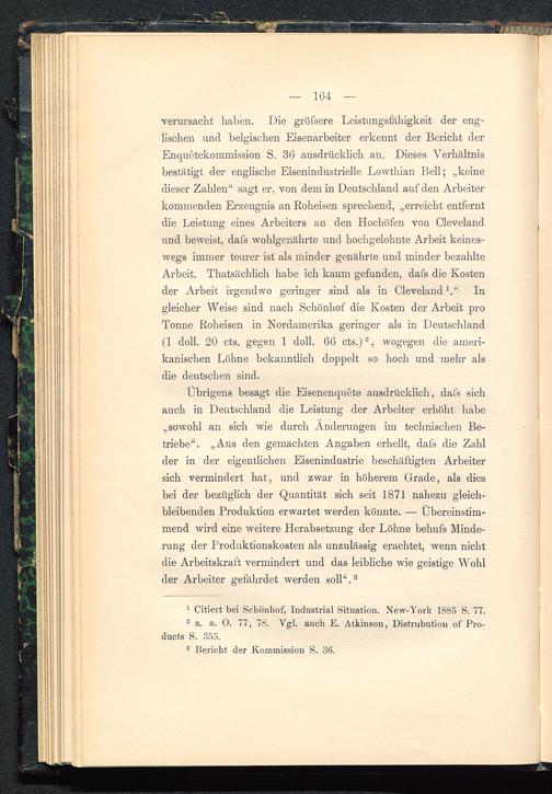 verursacht haben. Die gröfsere Leistungsfähigkeit der eng-lischen und belgischen Eisenarbeiter erkennt der Bericht derEnquetekommission S. 36 ausdrücklich an. Dieses Verhältnisbestätigt der englische Eisenindustrielle Lowthian Bell 5 „keinedieser Zahlen" sagt er, von dem in Deutschland auf den Arbeiterkommenden Erzeugnis an Roheisen sprechend, „erreicht entferntdie Leistung eines Arbeiters an den Hochöfen von Cleveland und beweist, dafs wohlgenährte und hochgelohnte Arbeit keines-wegs immer teurer ist als minder genährte und minder bezahlteArbeit. Thatsächlich habe ich kaum gefunden, dafs die Kostender Arbeit irgendwo geringer sind als in Cleveland 1 ." Ingleicher Weise sind nach Schönhof die Kosten der Arbeit proTonne Roheisen in Nordamerika geringer als in Deutschland (1 doli. 20 cts. gegen 1 doli. 66 cts.) 2 , wogegen die ameri-kanischen Löhne bekanntlich doppelt so hoch und mehr alsdie deutschen sind.