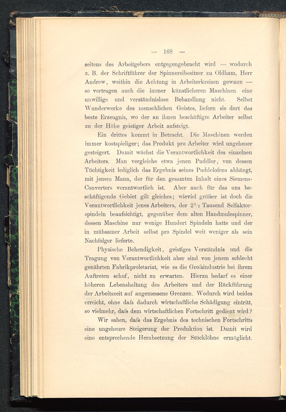 Ein drittes kommt in Betracht. Die Maschinen werdenimmer kostspieliger; das Produkt pro Arbeiter wird ungeheuergesteigert. Damit wächst die Verantwortlichkeit des einzelnenArbeiters. Man vergleiche etwa jenen Puddler, von dessenTüchtigkeit lediglich das Ergebnis seines Puddelofens abhängt,mit jenem Mann, der für den gesamten Inhalt eines Siemens-Converters verantwortlich ist. Aber auch für das uns be-schäftigende Gebiet gilt gleiches; wieviel gröfser ist doch dieVerantwortlichkeit jenes Arbeiters, der 2 V 2 Tausend Selfaktor-spindeln beaufsichtigt, gegenüber dem alten Handmulespinner,dessen Maschine nur wenige Hundert Spindeln hatte und derin mühsamer Arbeit selbst pro Spindel weit weniger als seinNachfolger lieferte.
