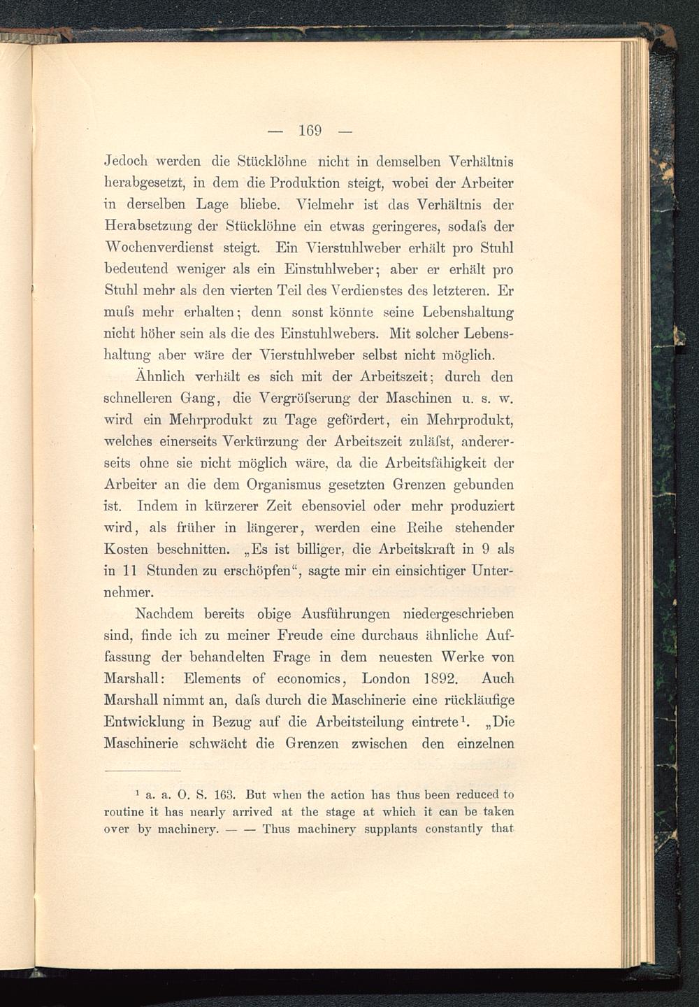 Nachdem bereits obige Ausführungen niedergeschriebensind, finde ich zu meiner Freude eine durchaus ähnliche Auf-fassung der behandelten Frage in dem neuesten Werke vonMarshall: Elements of economics, London 1892. AuchMarshall nimmt an, dafs durch die Maschinerie eine rückläufigeEntwicklung in Bezug auf die Arbeitsteilung eintrete 1 . „DieMaschinerie schwächt die Grenzen zwischen den einzelnen