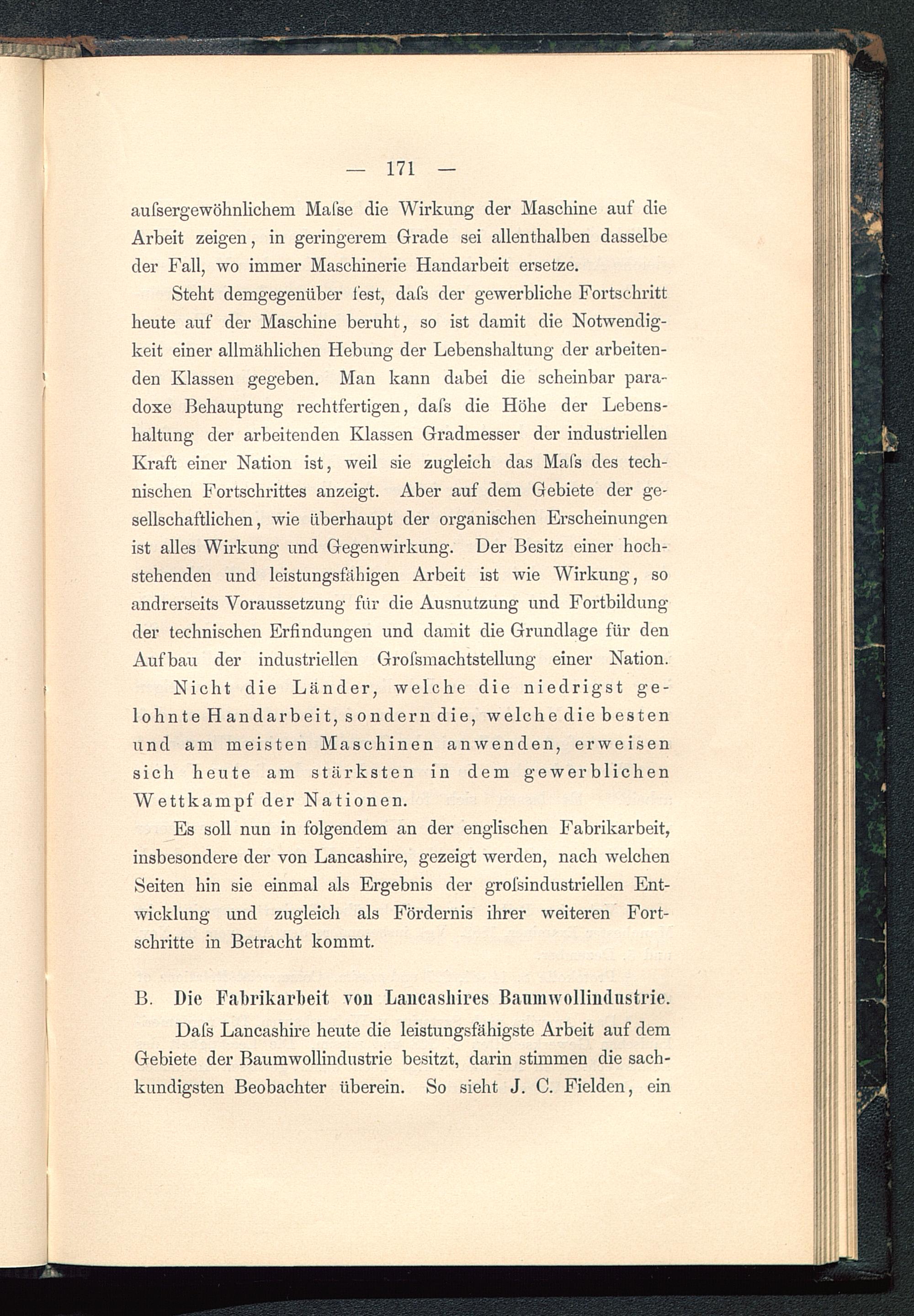 Dafs Lancashire heute die leistungsfähigste Arbeit auf demGebiete der Baum Wollindustrie besitzt, darin stimmen die sach-kundigsten Beobachter überein. So sieht J. C. Fielden, ein
