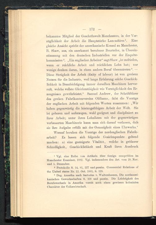 bekanntes Mitglied der Geschäftswelt Manchesters , in der Vor-züglichkeit der Arbeit die Hauptstärke Lancashires 1 . Einegleiche Ansicht spricht der amerikanische Konsul zu Manchester ,B. Shaw, aus, ein anerkannt berufener Beurteiler, in Überein-stimmung mit den deutschen Industriellen vor der Enquete-kommission 2 . „Ein englischer Arbeiter" sagt Shaw „ist zufrieden,wenn er reichliche Arbeit und reichlichen Lohn hat; nurwenige denken daran, in einen andern Beruf überzutreten 3 . —Diese Stetigkeit der Arbeit (fixity of labour) ist von grofsemNutzen für die Industrie, weil lange Erfahrung solche Geschick-lichkeit in Beaufsichtigung immer derselben Maschinen hervor-ruft, welche vollste Gleichmäfsigkeit wie Vorzüglichkeit des Er-zeugnisses gewährleistet." Samuel Andrew, der Schriftführerdes grofsen Fabrikantenvereins Oldhams, fafst die Vorzügeder englischen Arbeit mit folgenden Worten zusammen: „Wirhaben gegenwärtig die leistungsfähigste Arbeit der Welt. Sieist geboren und auferzogen, wohl geeignet und discipliniert zuihrer Arbeit; unter ihren Lohnlisten mit der gegenwärtigenverbesserten Maschinerie kann man sich darauf verlassen, dafssie ihre Aufgabe erfüllt mit der Genauigkeit eines Uhrwerks."