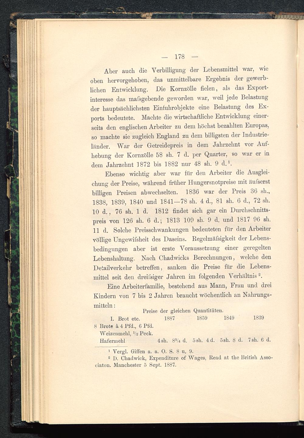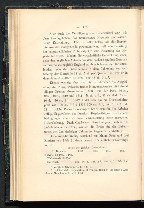 11 d. Solche Preisschwankungen bedeuteten für den Arbeitervöllige Ungewifsheit des Daseins. Regelmäfsigkeit der Lebens-bedingungen aber ist erste Voraussetzung einer geregeltenLebenshaltung. Nach Chadwicks Berechnungen, welche denDetailverkehr betreffen, sanken die Preise für die Lebens-mittel seit den dreifsiger Jahren im folgenden Verhältnis 2 .