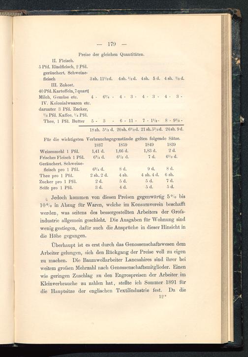 Überhaupt ist es erst durch das Genossenschaftswesen demArbeiter gelungen, sich den Rückgang der Preise voll zu eigenzu machen. Die Baumwollarbeiter Lancashires sind ihrer beiweitem grofsen Mehrzahl nach Genossenschaftsmitglieder. Einenwie geringen Zuschlag zu den Engrospreisen der Arbeiter imKleinverbrauche zu zahlen hat, stellte ich Sommer 1891 fürdie Hauptsitze der englischen Textilindustrie fest. Da die