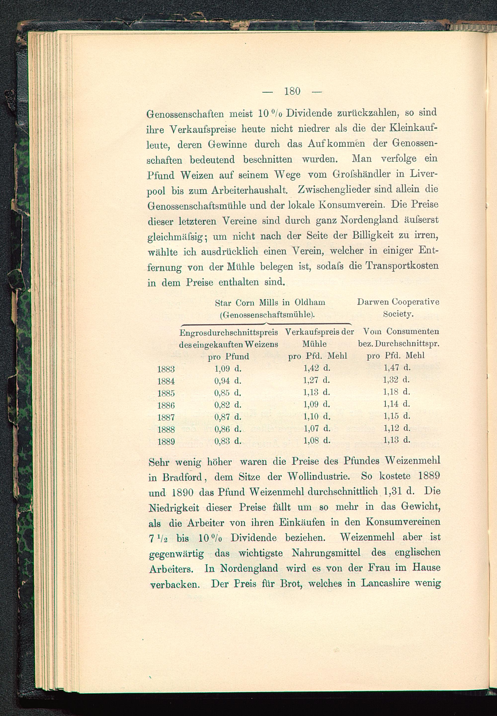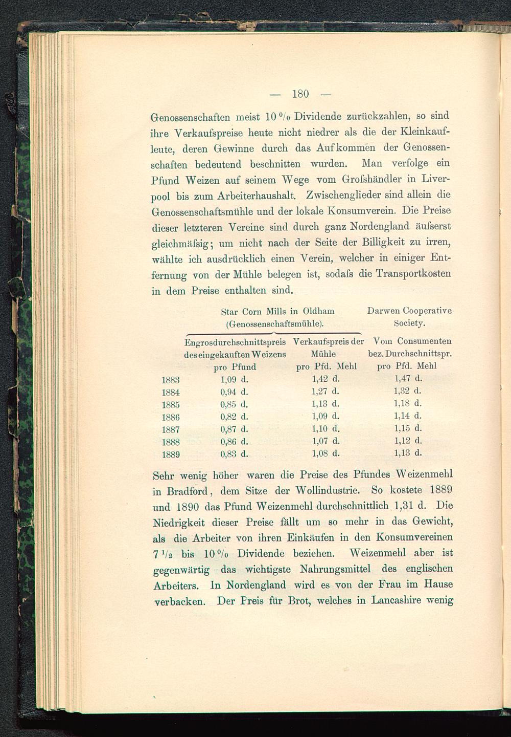 Genossenschaften meist 10 °/o Dividende zurückzahlen, so sindihre Verkaufspreise heute nicht niedrer als die der Kleinkauf-leute, deren Gewinne durch das Aufkommen der Genossen-schaften bedeutend beschnitten wurden. Man verfolge einPfund Weizen auf seinem Wege vom Grofshändler in Liver-pool bis zum Arbeiterhaushalt. Zwischenglieder sind allein dieGenossenschaftsmühle und der lokale Konsumverein. Die Preisedieser letzteren Vereine sind durch ganz Nordengland äufserstgleichmäfsig 5 um nicht nach der Seite der Billigkeit zu irren,wählte ich ausdrücklich einen Verein, welcher in einiger Ent-fernung von der Mühle belegen ist, sodafs die Transportkostenin dem Preise enthalten sind.
