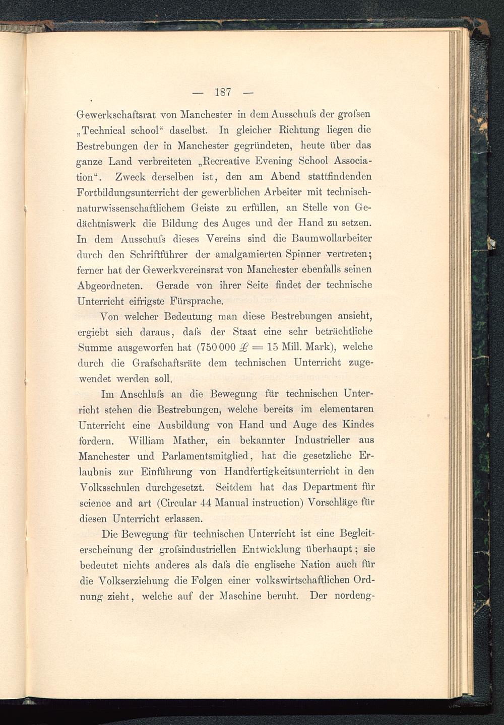 Im Anschlufs an die Bewegung für technischen Unter-richt stehen die Bestrebungen, welche bereits im elementarenUnterricht eine Ausbildung von Hand und Auge des Kindesfordern. William Mather, ein bekannter Industrieller ausManchester und Parlamentsmitglied, hat die gesetzliche Er-laubnis zur Einführung von Handfertigkeitsunterricht in denVolksschulen durchgesetzt. Seitdem hat das Department fürscience and art (Circular 44 Manual instruction) Vorschläge fürdiesen Unterricht erlassen.