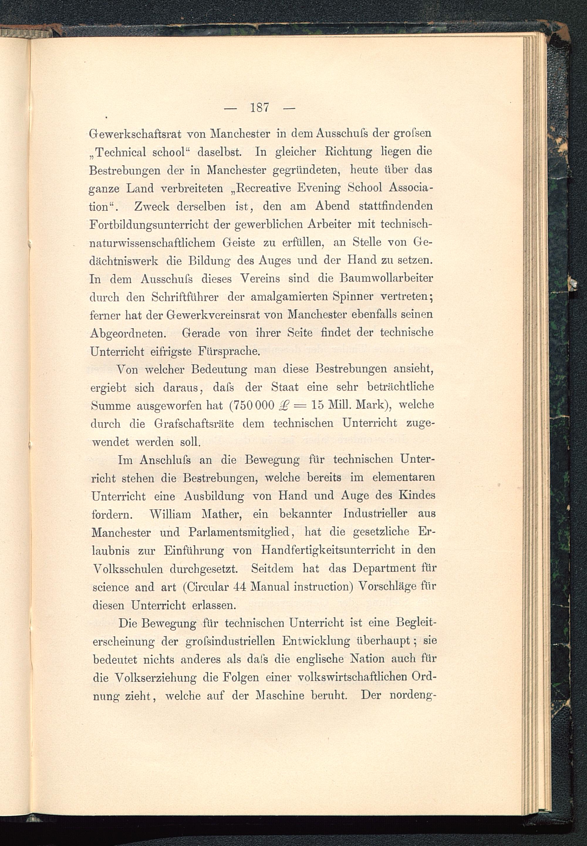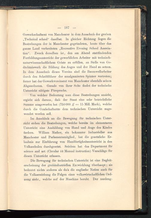 Die Bewegung für technischen Unterricht ist eine Begleit-erscheinung der grofsindustriellen Entwicklung überhaupt; siebedeutet nichts anderes als dal's die englische Nation auch fürdie Volkserziehung die Folgen einer volkswirtschaftlichen Ord-nung zieht, welche auf der Maschine beruht. Der nordeng-