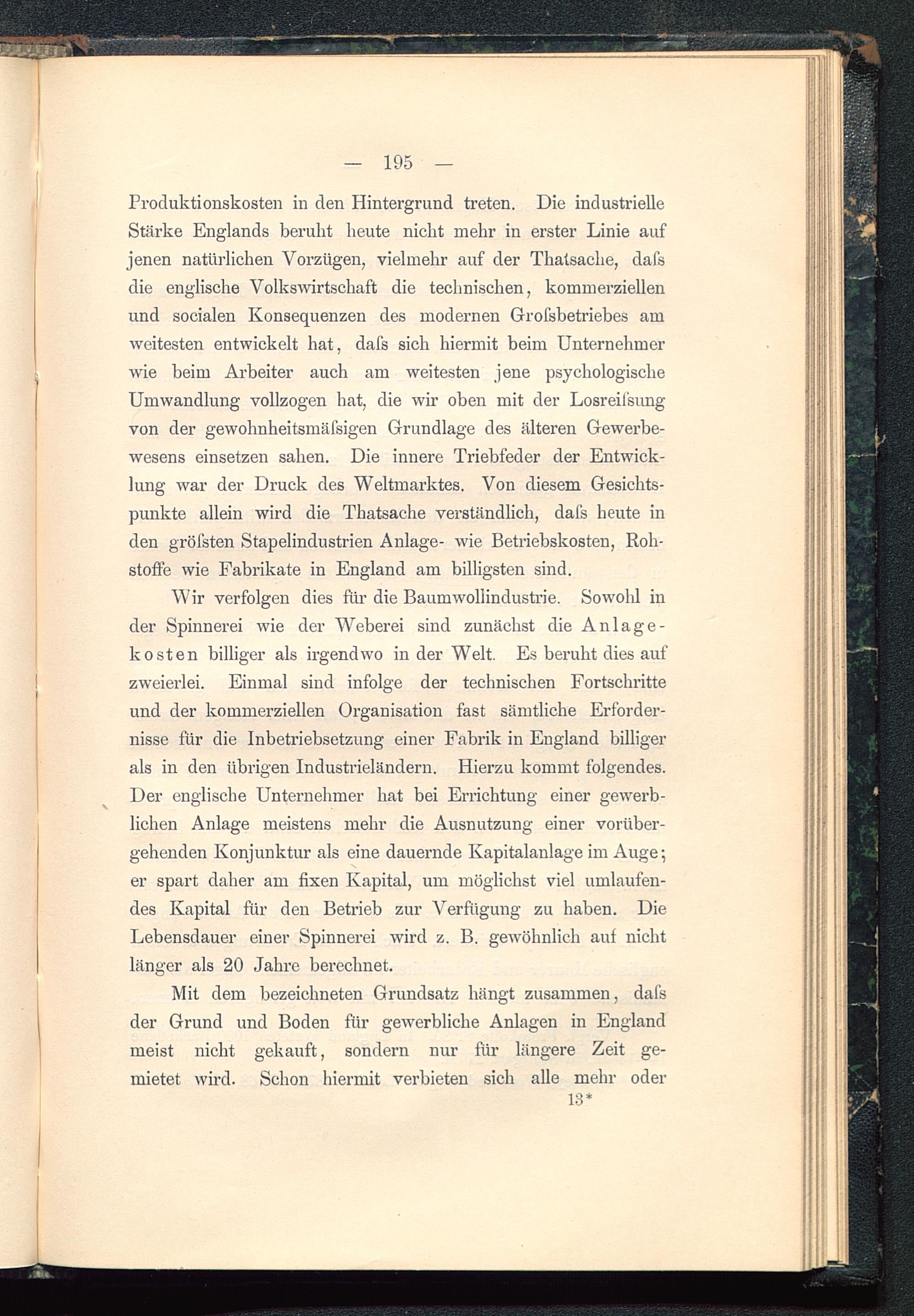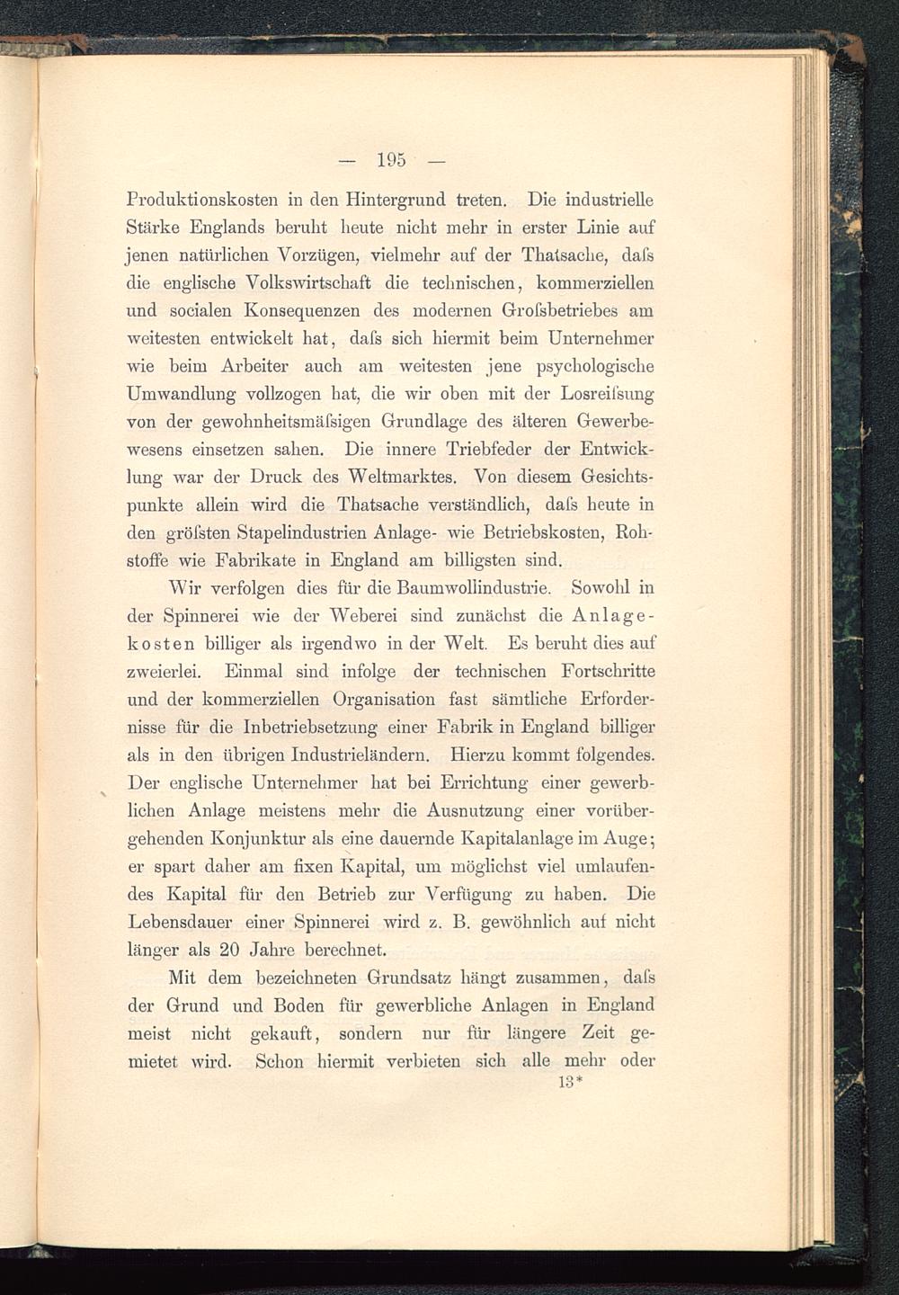 Produktionskosten in den Hintergrund treten. Die industrielleStärke Englands beruht heute nicht mehr in erster Linie aufjenen natürlichen Vorzügen, vielmehr auf der Thatsaclie, dafsdie englische Volkswirtschaft die technischen, kommerziellenund socialen Konsequenzen des modernen Grofsbetriebes amweitesten entwickelt hat, dafs sich hiermit beim Unternehmerwie beim Arbeiter auch am weitesten jene psychologischeUmwandlung vollzogen hat, die wir oben mit der Losreifsungvon der gewohnheitsmäfsigen Grundlage des älteren Gewerbe-wesens einsetzen sahen. Die innere Triebfeder der Entwick-lung war der Druck des Weltmarktes. Von diesem Gesichts-punkte allein wird die Thatsache verständlich, dafs heute inden gröfsten Stapelindustrien Anlage- wie Betriebskosten, Roh-stoffe wie Fabrikate in England am billigsten sind.
