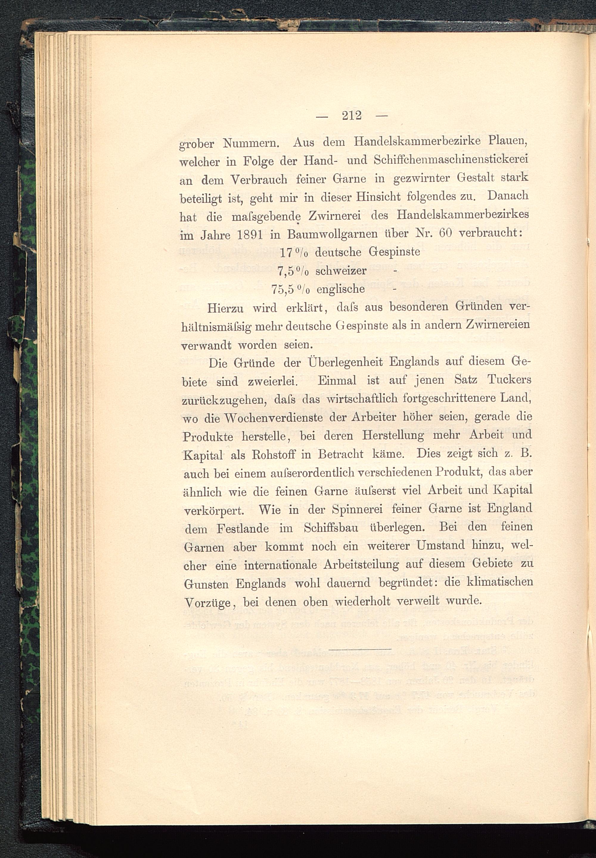 grober Nummern. Aus dem Handelskammerbezirke Plauen,welcher in Folge der Hand- und Schiffchenmascbinenstickereian dem Verbrauch feiner Garne in gezwirnter Gestalt starkbeteiligt ist, geht mir in dieser Hinsicht folgendes zu. Danachhat die mafsgebende Zwirnerei des Handelskammerbezirkesim Jahre 1891 in Baumwollgarnen über Nr. 60 verbraucht:17°/o deutsche Gespinste7,5 °/o schweizer75,5 °/o englischeHierzu wird erklärt, dafs aus besonderen Gründen ver-hältnismäfsig mehr deutsche Gespinste als in andern Zwirnereienverwandt worden seien.