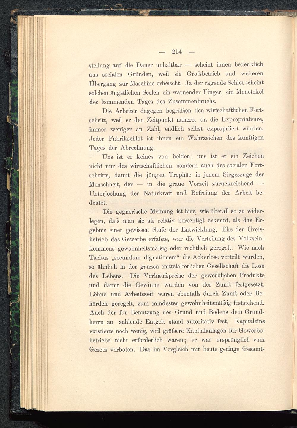 Die gegnerische Meinung ist hier, wie überall so zu wider-legen, dafs man sie als relativ berechtigt erkennt, als das Er-gebnis einer gewissen Stufe der Entwicklung. Ehe der Grofs-betrieb das Gewerbe erfafste, war die Verteilung des Volksein-kommens gewohnheitsmäfsig oder rechtlich geregelt. Wie nachTacitus „secundum dignationem" die Ackerlose verteilt wurden,so ähnlich in der ganzen mittelalterlichen Gesellschaft die Losedes Lebens. Die Verkaufspreise der gewerblichen Produkteund damit die Gewinne wurden von der Zunft festgesetzt.Löhne und Arbeitszeit waren ebenfalls durch Zunft oder Be-hörden geregelt, zum mindesten gewohnheitsmäfsig feststehend.Auch der für Benutzung des Grund und Bodens dem Grund-herrn zu zahlende Entgelt stand autoritativ fest. Kapitalzinsexistierte noch wenig, weil gröfsere Kapitalanlagen für Gewerbe-betriebe nicht erforderlich waren; er war ursprünglich vomGesetz verboten. Das im Vergleich mit heute geringe Gesamt-