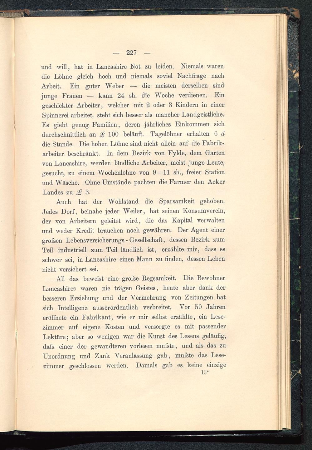Auch hat der Wohlstand die Sparsamkeit gehoben.Jedes Dorf, beinahe jeder Weiler, hat seinen Konsumverein,der von Arbeitern geleitet wird, die das Kapital verwaltenund weder Kredit brauchen noch gewähren. Der Agent einergrofsen Lebensversicherungs - Gesellschaft, dessen Bezirk zumTeil industriell zum Teil ländlich ist, erzählte mir, dass esschwer sei, in Lancashire einen Mann zu finden, dessen Lebennicht versichert sei.
