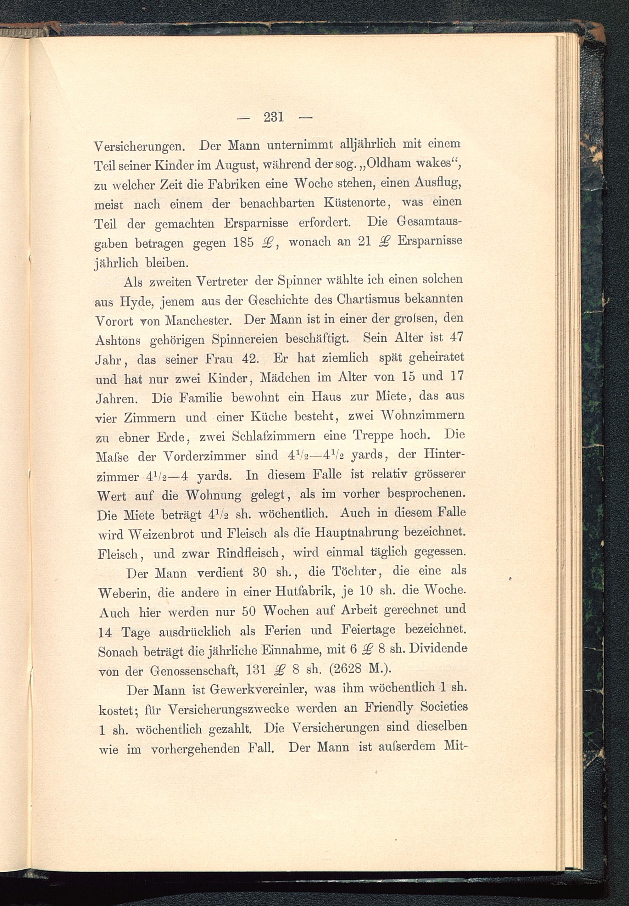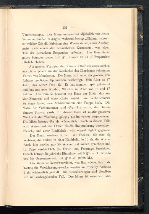 Versicherungen. Der Mann unternimmt alljährlich mit einemTeil seiner Kinder im August, während der sog. „Oldham wakes",zu welcher Zeit die Fabriken eine Woche stehen, einen Ausflug,meist nach einem der benachbarten Küstenorte, was einenTeil der gemachten Ersparnisse erfordert. Die Gesamtaus-gaben betragen gegen 185 ■£, wonach an 21 '£ Ersparnissejährlich bleiben.