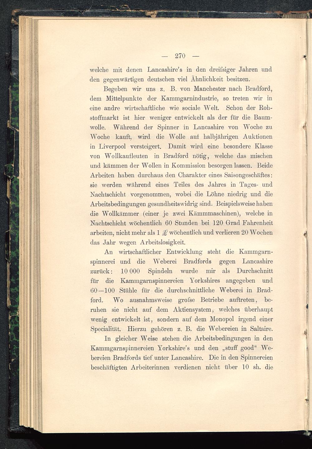 Begeben wir uns z. B. von Manchester nach Bradford,dem Mittelpunkte der Kammgarnindustrie, so treten wir ineine andre wirtschaftliche wie sociale Welt. Schon der Roh-stoffmarkt ist hier weniger entwickelt als der für die Baum-wolle. Während der Spinner in Lancashire von Woche zuWoche kauft, wird die Wolle auf halbjährigen Auktionenin Liverpool versteigert. Damit wird eine besondere Klassevon Wollkaufleuten in Bradford nötig, welche das mischenund kämmen der Wollen in Kommission besorgen lassen. BeideArbeiten haben durchaus den Charakter eines Saisongeschäftes:sie werden während eines Teiles des Jahres in Tages- undNachtschicht vorgenommen, wobei die Löhne niedrig und dieArbeitsbedingungen gesundheitswidrig sind. Beispielsweise habendie Wollkämmer (einer je zwei Kämmmaschinen), welche inNachtschicht wöchentlich 60 Stunden bei 120 Grad Fahrenheitarbeiten, nicht mehr als 1 wöchentlich und verlieren 20 Wochendas Jahr wegen Arbeitslosigkeit.