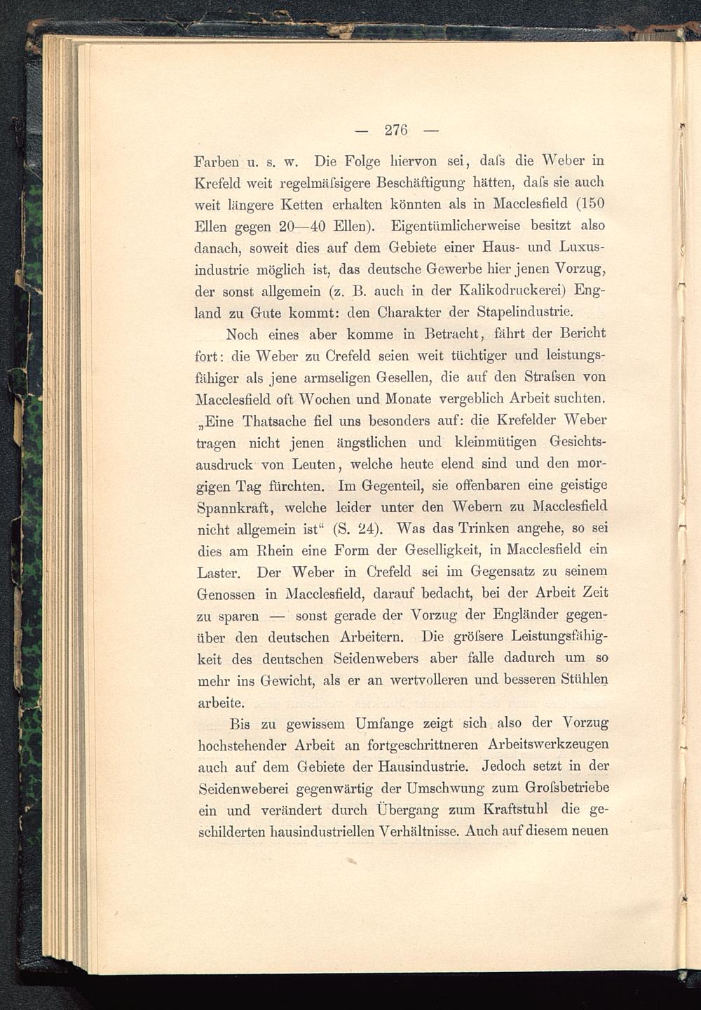 Farben u. s. w. Die Folge hiervon sei, dafs die Weber inKrefeld weit regelmäfsigere Beschäftigung hätten, dafs sie auchweit längere Ketten erhalten könnten als in Macclesfield (150Ellen gegen 20—40 Ellen). Eigentümlicherweise besitzt alsodanach, soweit dies auf dem Gebiete einer Haus- und Luxus-industrie möglich ist, das deutsche Gewerbe hier jenen Vorzug,der sonst allgemein (z. B. auch in der Kalikodruckerei) Eng-land zu Gute kommt: den Charakter der Stapelindustrie.