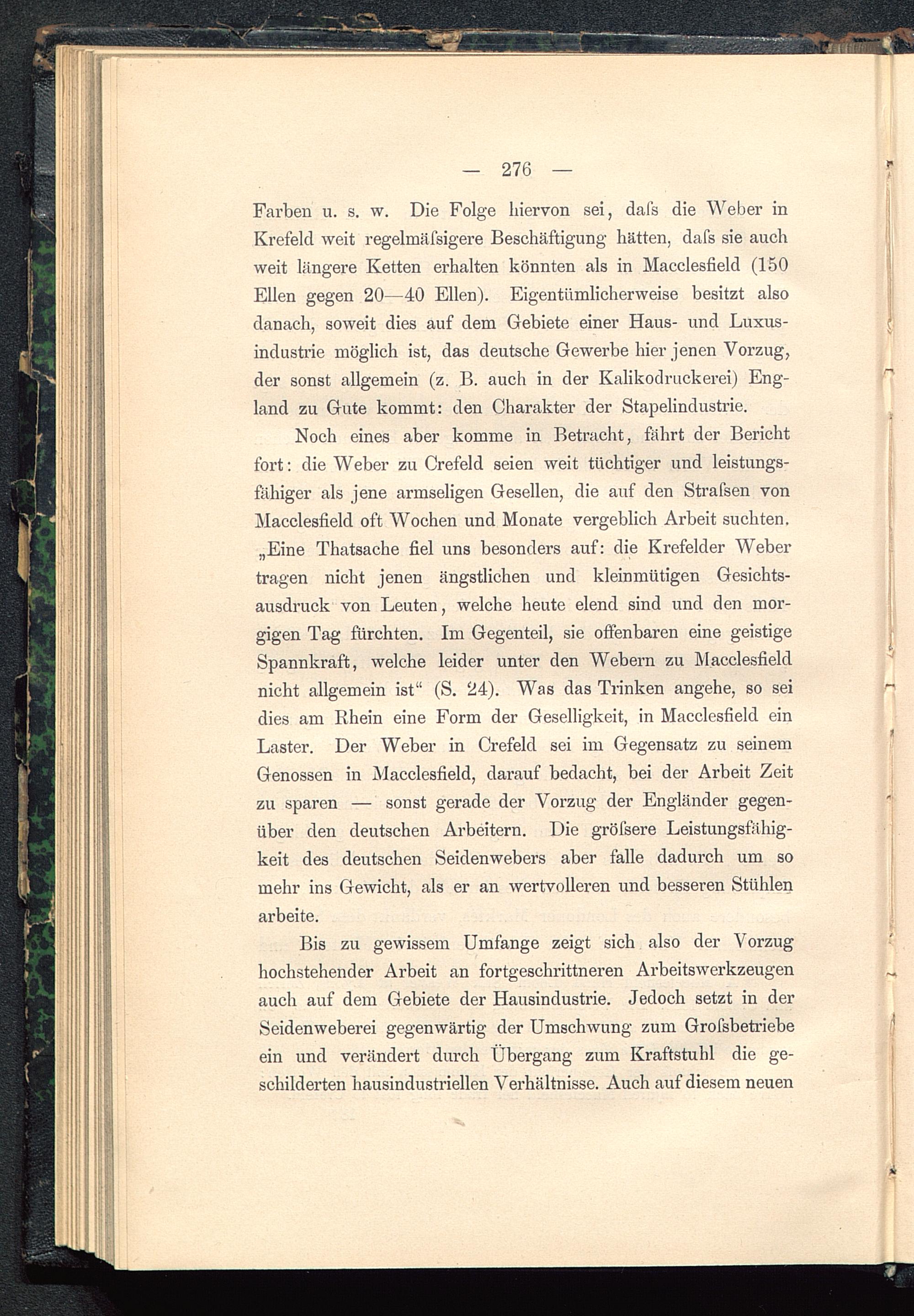 Noch eines aber komme in Betracht, fährt der Berichtfort: die Weber zu Crefeld seien weit tüchtiger und leistungs-fähiger als jene armseligen Gesellen, die auf den Strafsen vonMacclesfield oft Wochen und Monate vergeblich Arbeit suchten.„Eine Thatsache fiel uns besonders auf: die Krefelder Webertragen nicht jenen ängstlichen und kleinmütigen Gesichts-ausdruck von Leuten, welche heute elend sind und den mor-gigen Tag fürchten. Im Gegenteil, sie offenbaren eine geistigeSpannkraft, welche leider unter den Webern zu Macclesfield nicht allgemein ist" (S. 24). Was das Trinken angehe, so seidies am Rhein eine Form der Geselligkeit, in Macclesfield einLaster. Der Weber in Crefeld sei im Gegensatz zu seinemGenossen in Macclesfield , darauf bedacht, bei der Arbeit Zeitzu sparen — sonst gerade der Vorzug der Engländer gegen-über den deutschen Arbeitern. Die gröfsere Leistungsfähig-keit des deutschen Seidenwebers aber falle dadurch um somehr ins Gewicht, als er an wertvolleren und besseren Stühlenarbeite.