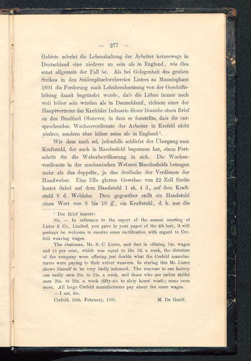 Gebiete scheint die Lebenshaltung der Arbeiter keineswegs inDeutschland eine niedrere zu sein als in England , wie diessonst allgemein der Fall ist. Als bei Gelegenheit des grofsenStrikes in den Seidenplüschwebereien Listers zu Manningham1891 die Forderung nach Lohnherabsetzung von der Geschäfts-leitung damit begründet wurde, dafs die Löhne immer nochweit höher sein würden als in Deutschland , richtete einer derHauptvertreter der Krefelder Industrie dieser Branche einen Briefan den Bradford Observer, in dem er feststellte, dafs die ent-sprechenden Wochenverdienste der Arbeiter in Krefeld nichtniedrer, sondern eher höher seien als in England 1 .
