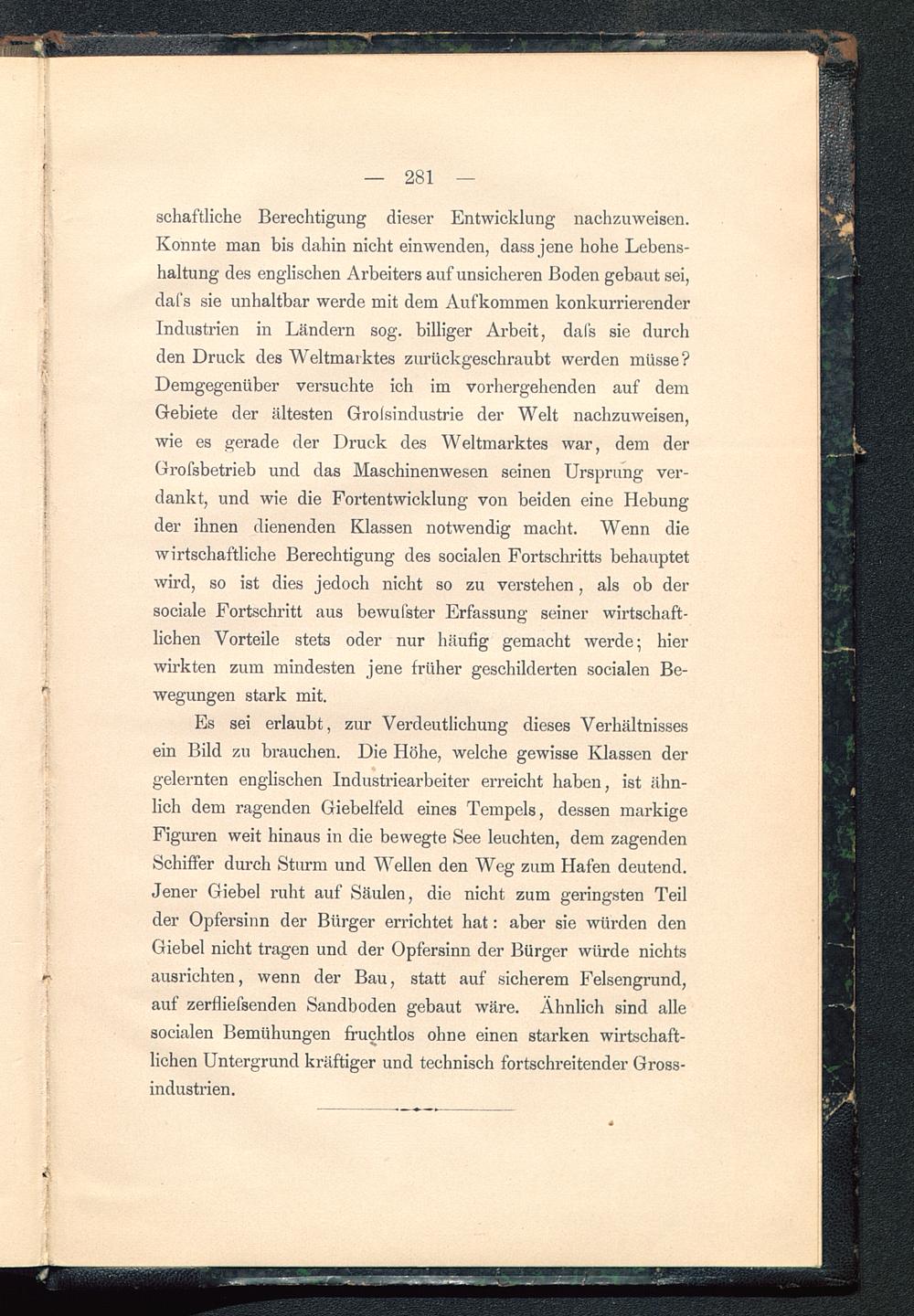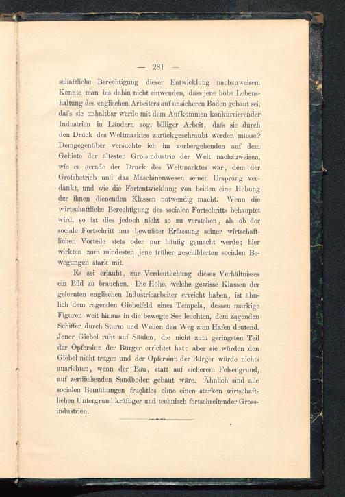Es sei erlaubt, zur Verdeutlichung dieses Verhältnissesein Bild zu brauchen. Die Höhe, welche gewisse Klassen dergelernten englischen Industriearbeiter erreicht haben, ist ähn-lich dem ragenden Giebelfeld eines Tempels, dessen markigeFiguren weit hinaus in die bewegte See leuchten, dem zagendenSchiffer durch Sturm und Wellen den Weg zum Hafen deutend.Jener Giebel ruht auf Säulen, die nicht zum geringsten Teilder Opfersinn der Bürger errichtet hat: aber sie würden denGiebel nicht tragen und der Opfersinn der Bürger würde nichtsausrichten, wenn der Bau, statt auf sicherem Felsengrund,auf zerfliefsenden Sandboden gebaut wäre. Ähnlich sind allesocialen Bemühungen fruchtlos ohne einen starken wirtschaft-lichen Untergrund kräftiger und technisch fortschreitender Gross-industrien.