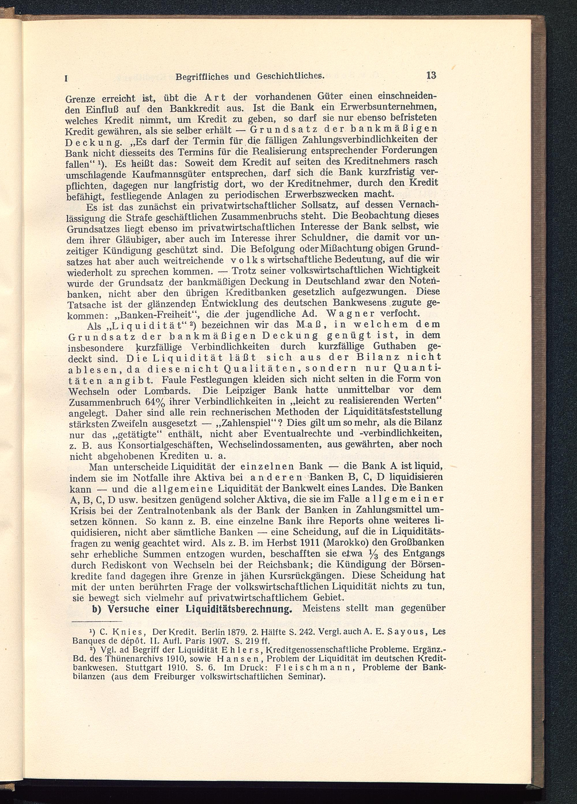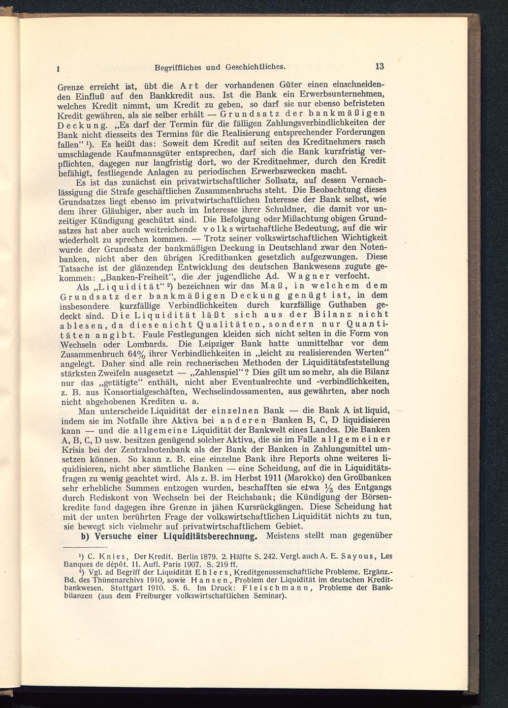 2 ) Vgl. ad Begriff der Liquidität Ehlers, Kreditgenossenschaftliche Probleme. Ergänz.-Bd. des Thünenarchivs 1910, sowie Hansen, Problem der Liquidität im deutschen Kredit-bankwesen. Stuttgart 1910. S. 6. Im Druck: Fleischmann, Probleme der Bank-bilanzen (aus dem Freiburger volkswirtschaftlichen Seminar).