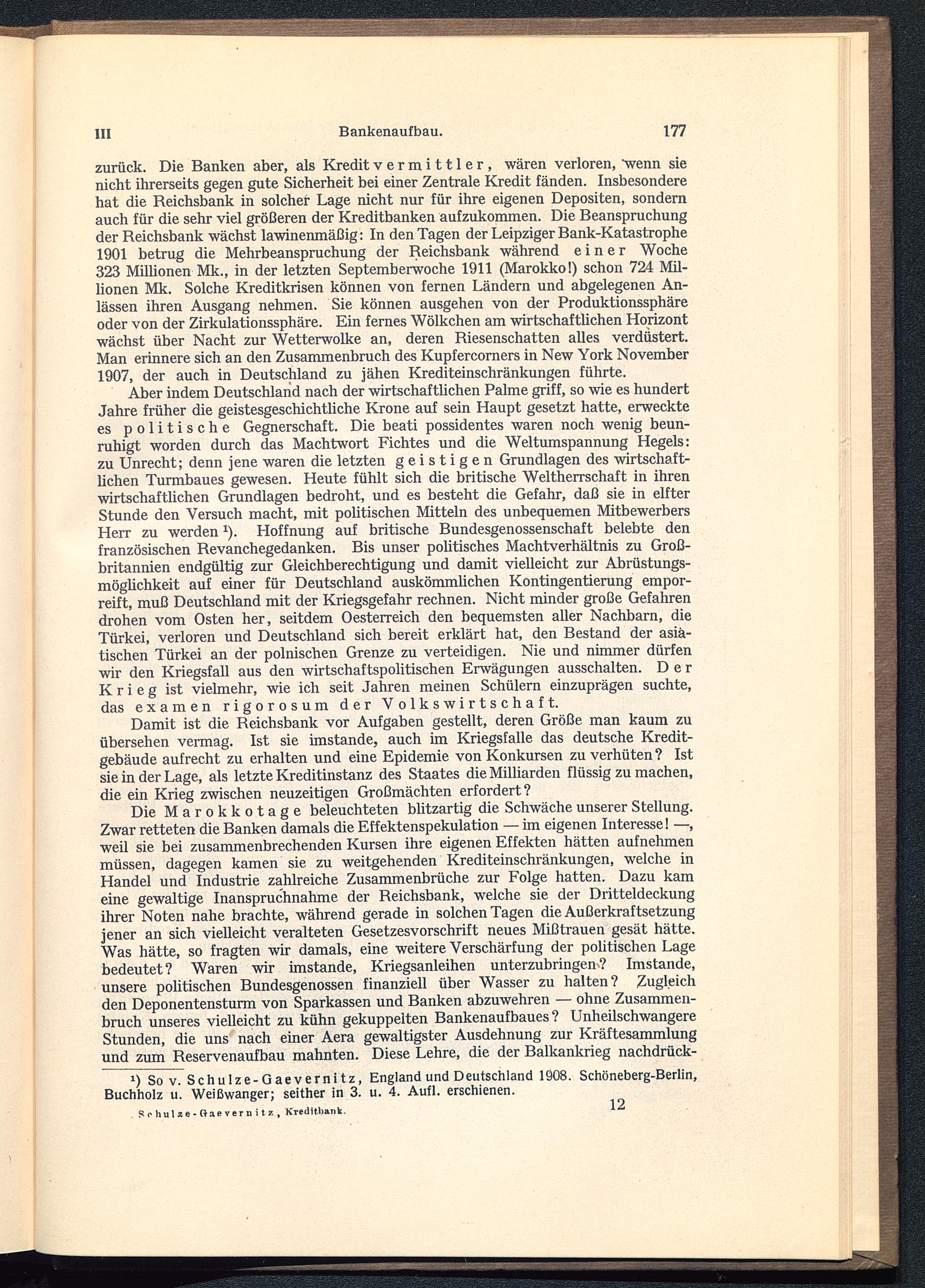 zurück. Die Banken aber, als Kredit vermittler, wären verloren, wenn sienicht ihrerseits gegen gute Sicherheit bei einer Zentrale Kredit fänden. Insbesonderehat die Reichsbank in solcher Lage nicht nur für ihre eigenen Depositen, sondernauch für die sehr viel größeren der Kreditbanken aufzukommen. Die Beanspruchungder Reichsbank wächst lawinenmäßig: In den Tagen der Leipziger Bank-Katastrophe1901 betrug die Mehrbeanspruchung der Reichsbank während einer Woche323 Millionen Mk., in der letzten Septemberwoche 1911 (Marokko !) schon 724 Mil-lionen Mk. Solche Kreditkrisen können von fernen Ländern und abgelegenen An-lässen ihren Ausgang nehmen. Sie können ausgehen von der Produktionssphäreoder von der Zirkulationssphäre. Ein fernes Wölkchen am wirtschaftlichen Horizontwächst über Nacht zur Wetterwolke an, deren Riesenschatten alles verdüstert.Man erinnere sich an den Zusammenbruch des Kupfercorners in New York November1907, der auch in Deutschland zu jähen Krediteinschränkungen führte.